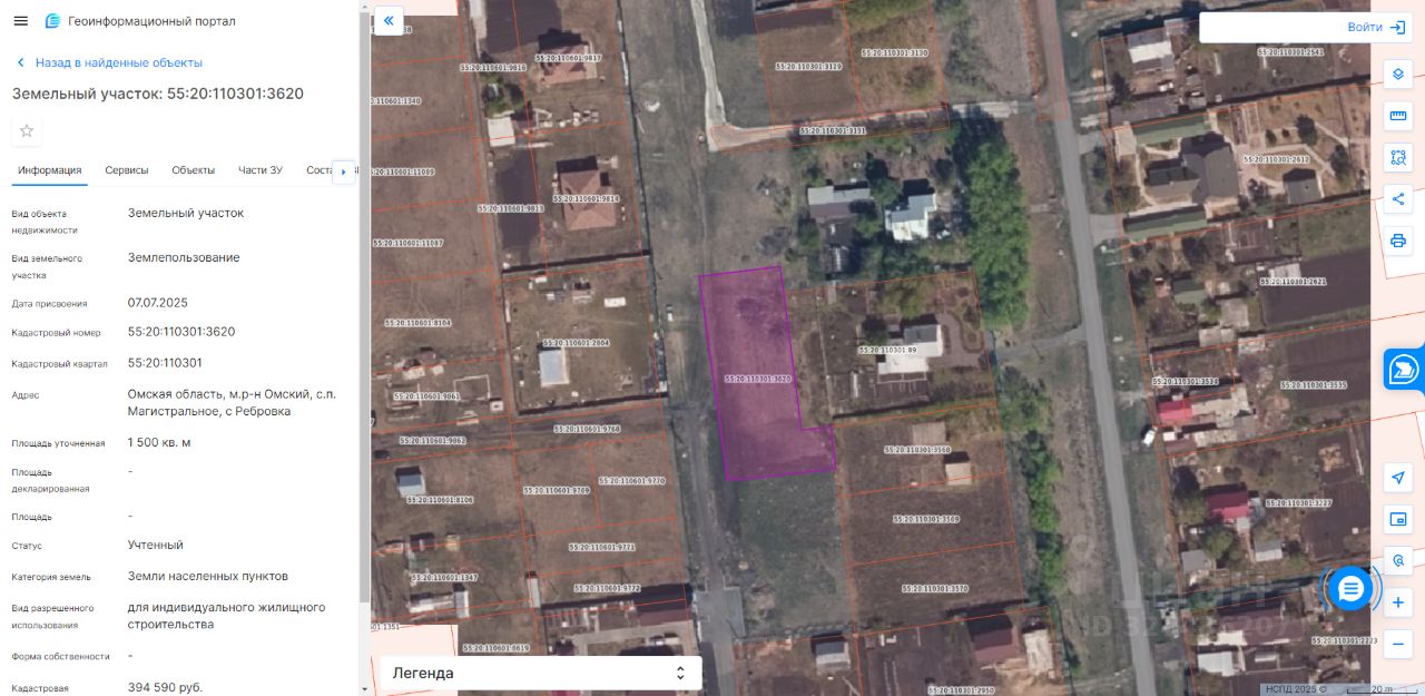 земельный участок, государственная собственность на который не разграничена, с кадастровым номером 55:20:110301:3620, площадью 1500 кв. м., из категории земель населенных пунктов, с видом разрешенного использования — для индивидуального жилищного строительства, расположенного в границах Магистрального сельского поселения Омского муниципального района Омской области, местоположение которого: Омская область, Омский район, Магистральное сельское поселение, с. Ребровка