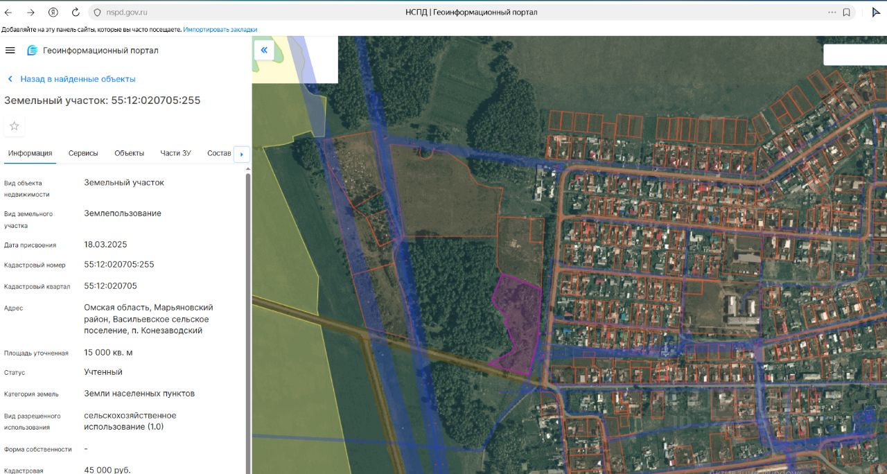 Земельный участок: Омская область, Марьяновский район, Васильевское сельское поселение, п. Конезаводский. Площадь: 15 000 кв.м. Земли населенных пунктов, сельскохозяйственное использование (1.0). Кадастровый номер: 55:12:020705:255.