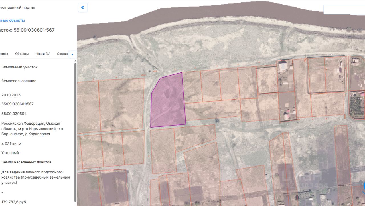 Лот 1 - земельный участок с кадастровым номером 55:09:030601:567, площадью 4031 кв. м., категория земель: земли населенных пунктов, вид разрешенного использования: для ведения личного подсобного хозяйства (приусадебный земельный участок), местоположение: Российская Федерация, Омская область, Кормиловский район, с. п. Борчанское, д. Корниловка