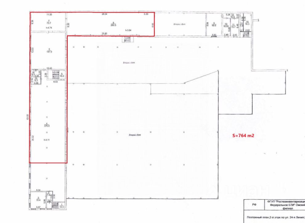 - Второй этаж: 764 м²