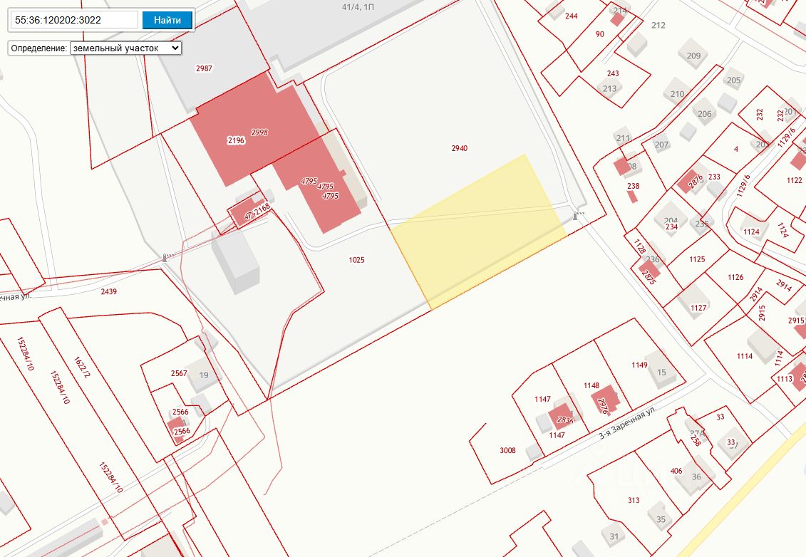 Земельный участок из состава земель населенных пунктов с кадастровым номером 55:36:120202:3022. Местоположение земельного участка установлено в 100 м северо-западнее относительно жилого дома, расположенного по адресу: Омская область, город Омск, Центральный административный округ, улица 3-я Заречная, дом 13. Площадь земельного участка: 3219 кв. м.