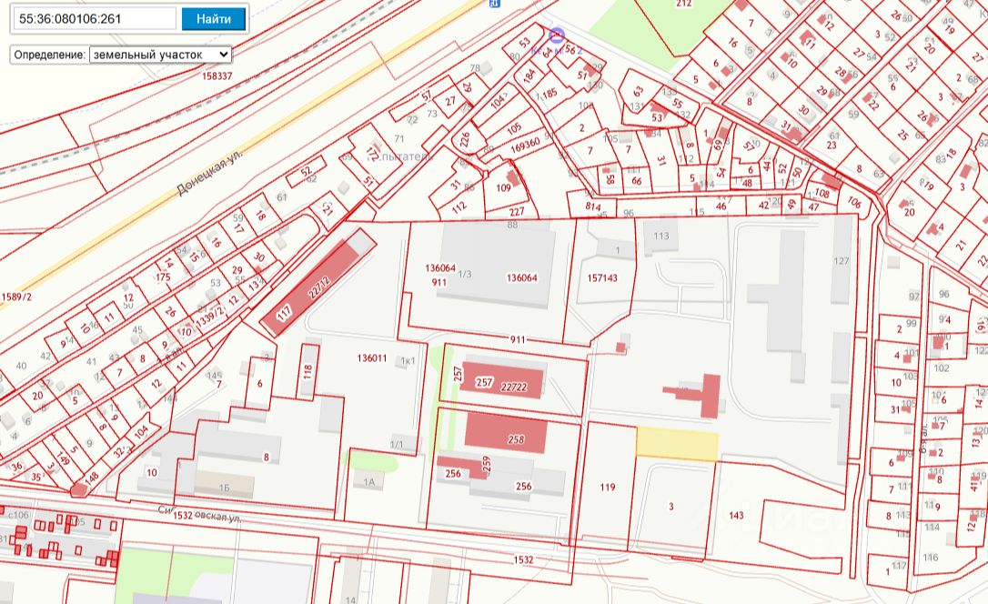 Земельный участок из состава земель населенных пунктов с кадастровым номером 55:36:080106:261. Местоположение земельного участка установлено в 280 м юго-восточнее относительно здания, расположенного по адресу: Омская область, город Омск, Центральный административный округ, улица Сибмисовская, дом 1. Площадь земельного участка: 1233 кв. м.