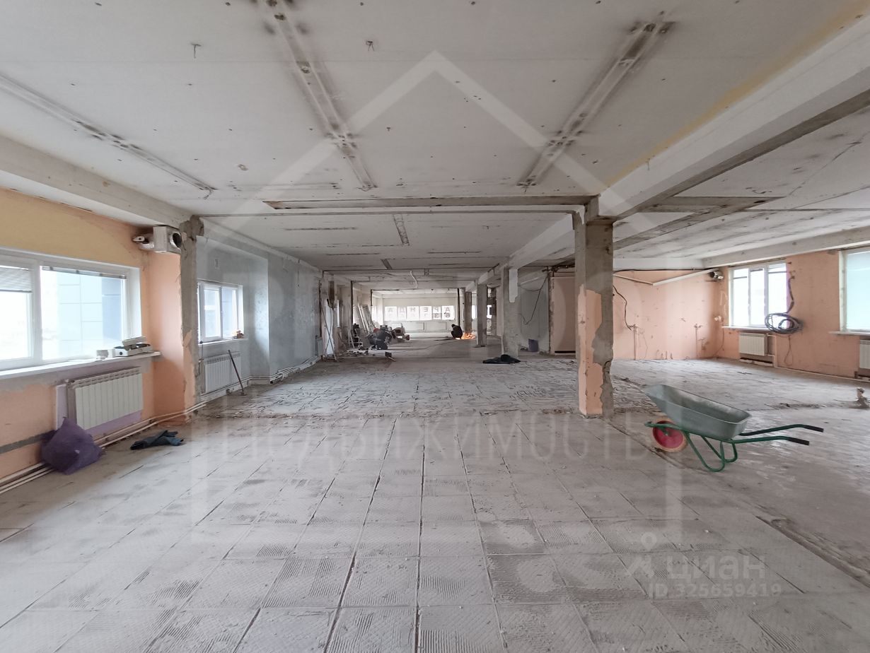 В помещении много дневного света, высокий потолок, два отдельных входа, несколько мокрых точек.