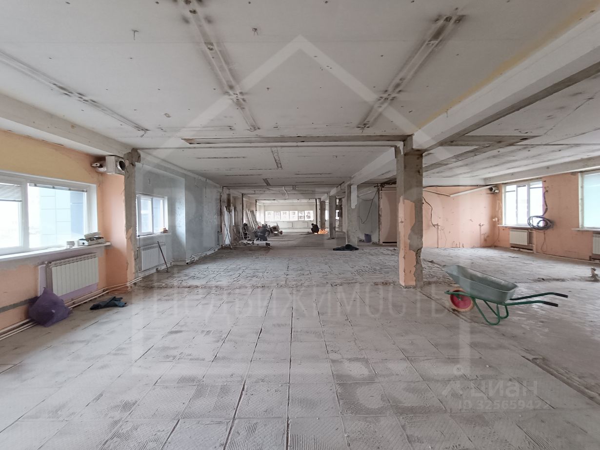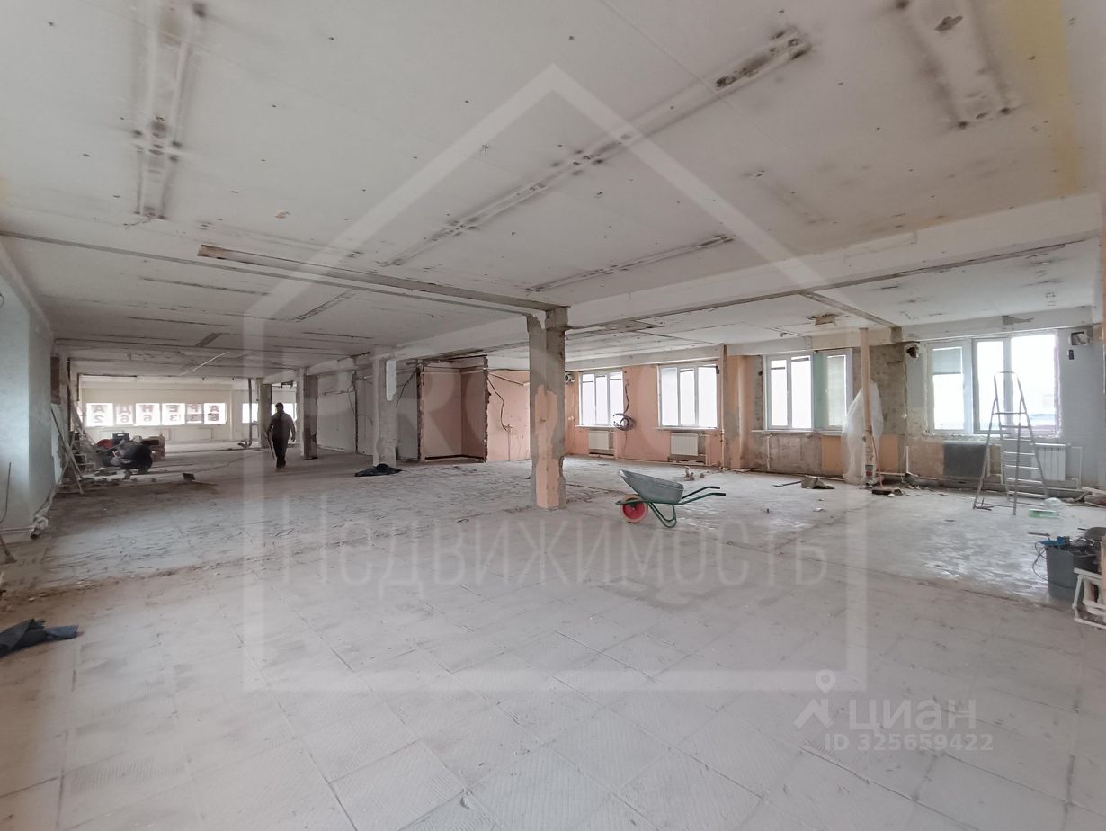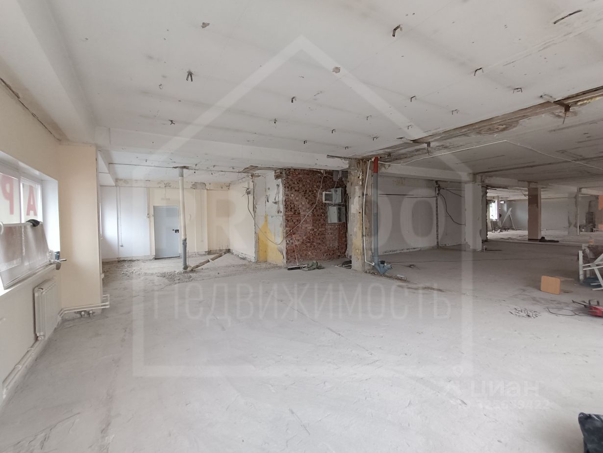 В помещении много дневного света, высокий потолок, отдельный вход, несколько мокрых точек.