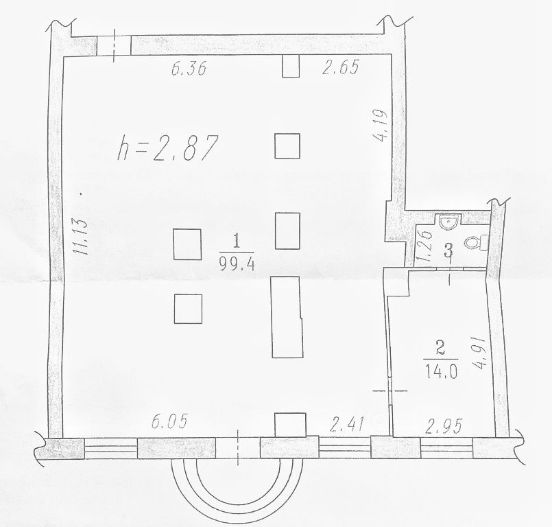 Длина фасада 12 метров. Торговый зал 99,4 кв. м. Высота потолка 2,9 м.