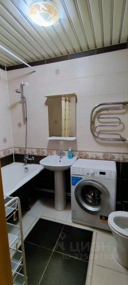 Санузел совмещённый, оснащён ванной и стиральной машиной Indеsit. Новый стеллаж для удобного хранения.
