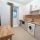 На кухне холодильник, стиральная машина, чайник электрический, посуда