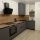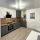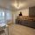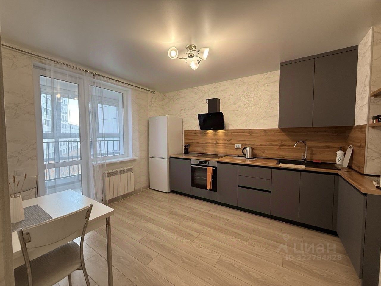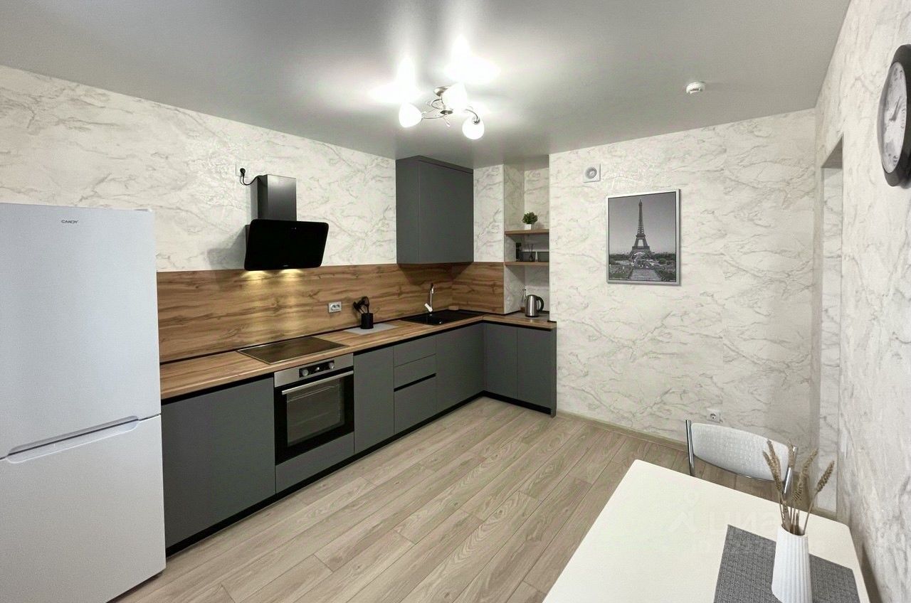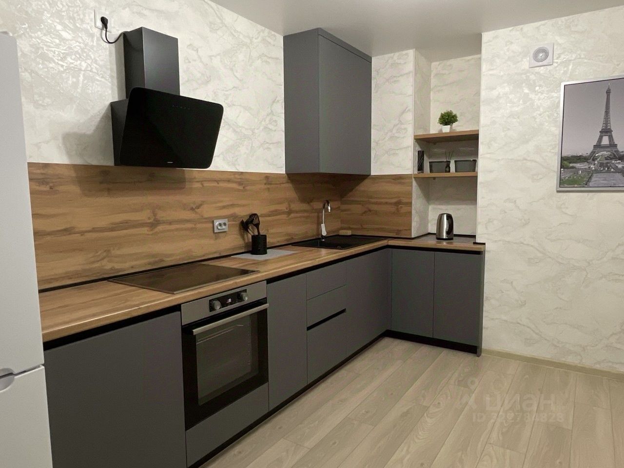 Абсолютно новая современная кухня с техникой: холодильник, варочная панель, вытяжка, духовой шкаф, стиральная машина, чайник, посуда, кастрюля, сковорода.