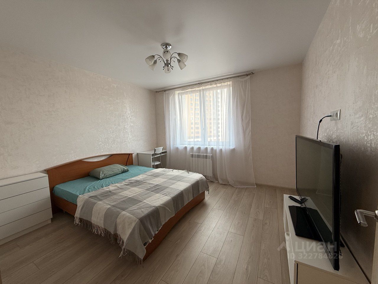 Жилая комната с большой кроватью, рабочей зоной, телевизором LG с атмосферной подсветкой, новым ортопедическим матрасом.