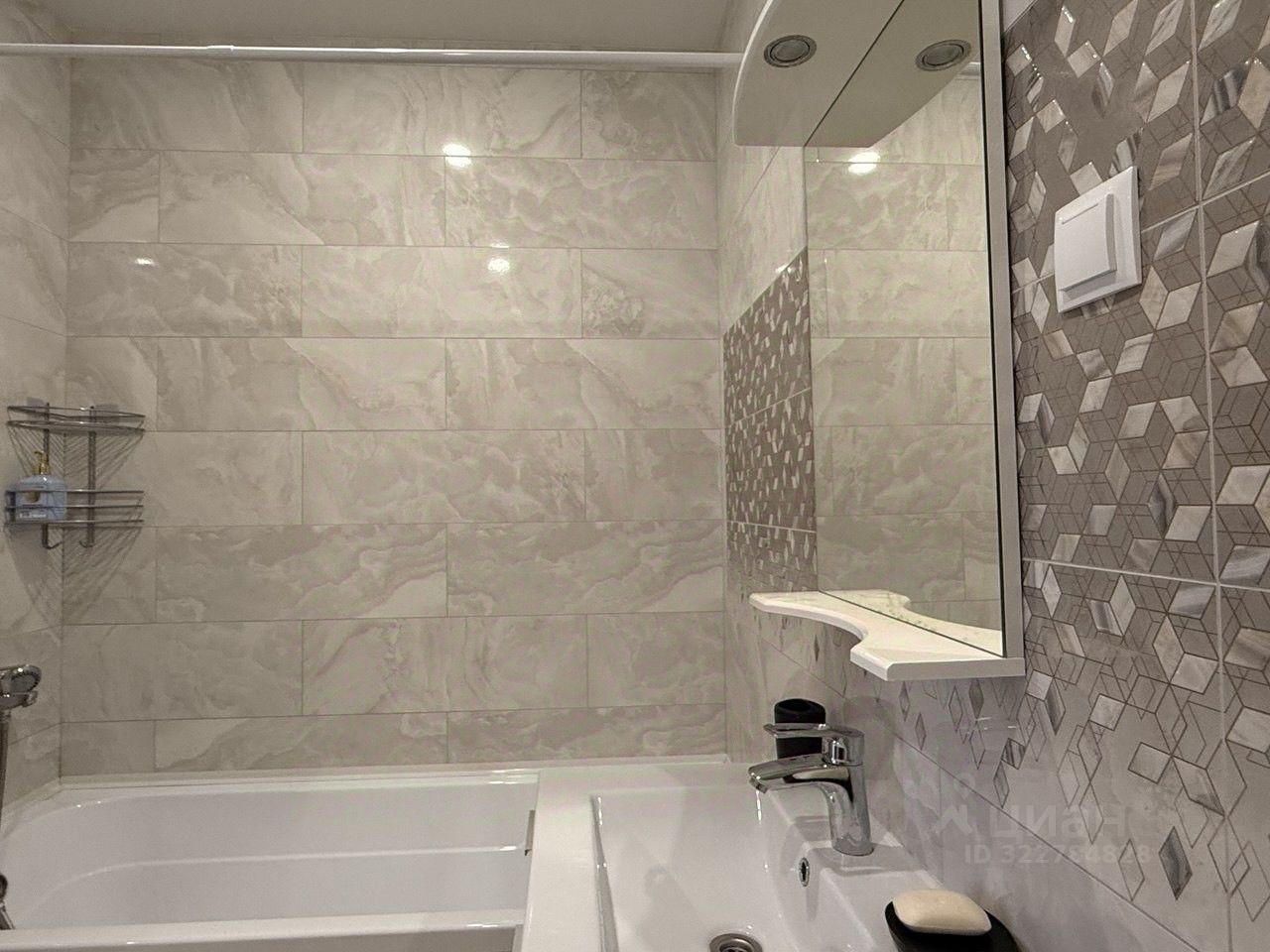 Уютная ванная, оборудованная полочками и аксессуарами.