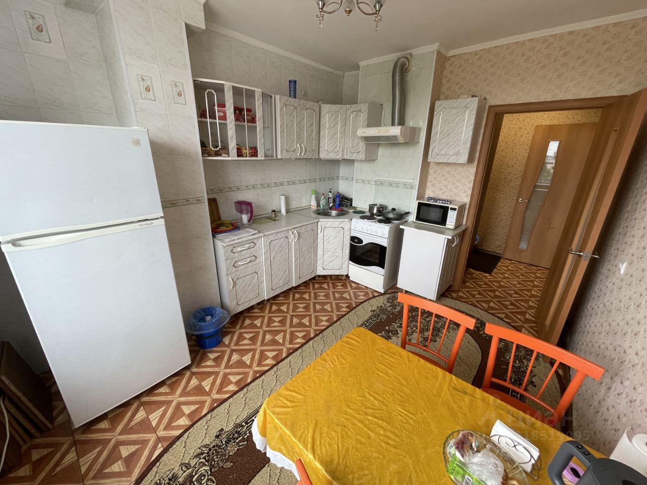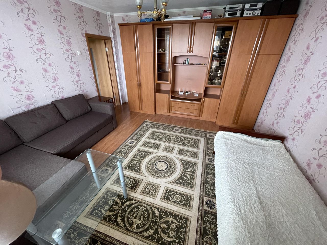 В комнате 2 спальных места - двухместный диван. В прихожей шкаф-купе, в комнате стенка с большим количеством мест хранения. На кухне электроплита, вытяжка, холодильник, микроволновка, электрический чайник, стол и стулья, в ванной - стиральная машинка.