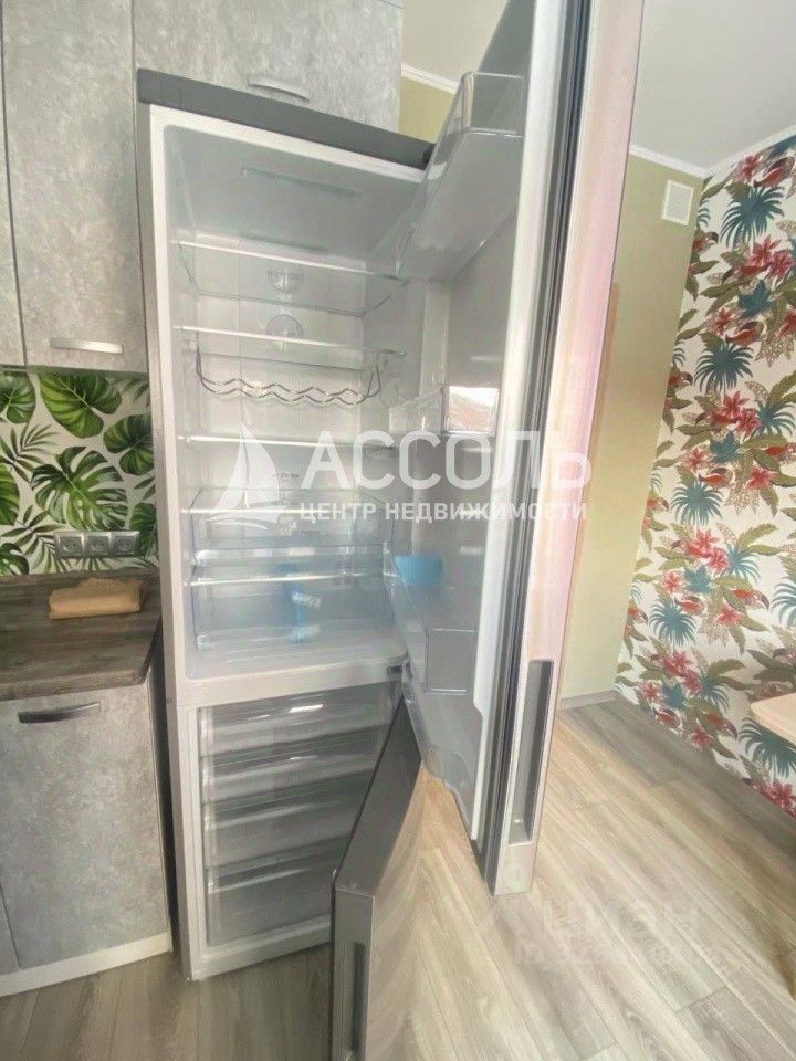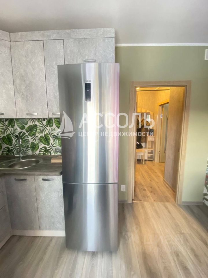 Полностью оборудованная кухня с новым холодильником и современным кухонным гарнитуром.