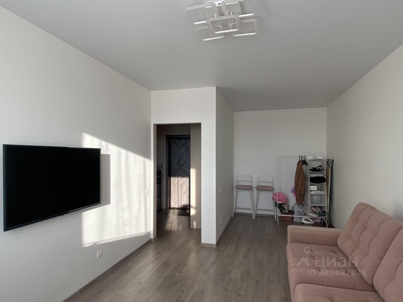 В просторной комнате площадью 20 м² расположен большой раскладной диван, стол и вешалка (телевизора не будет).