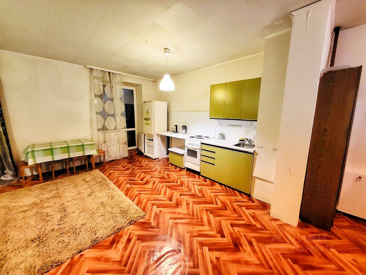 Состояние отличное, выполнен качественный современный ремонт. Мебель и бытовая техника вся необходимая для комфортного проживания имеется. Лоджия застеклена, прекрасный вид с окна.