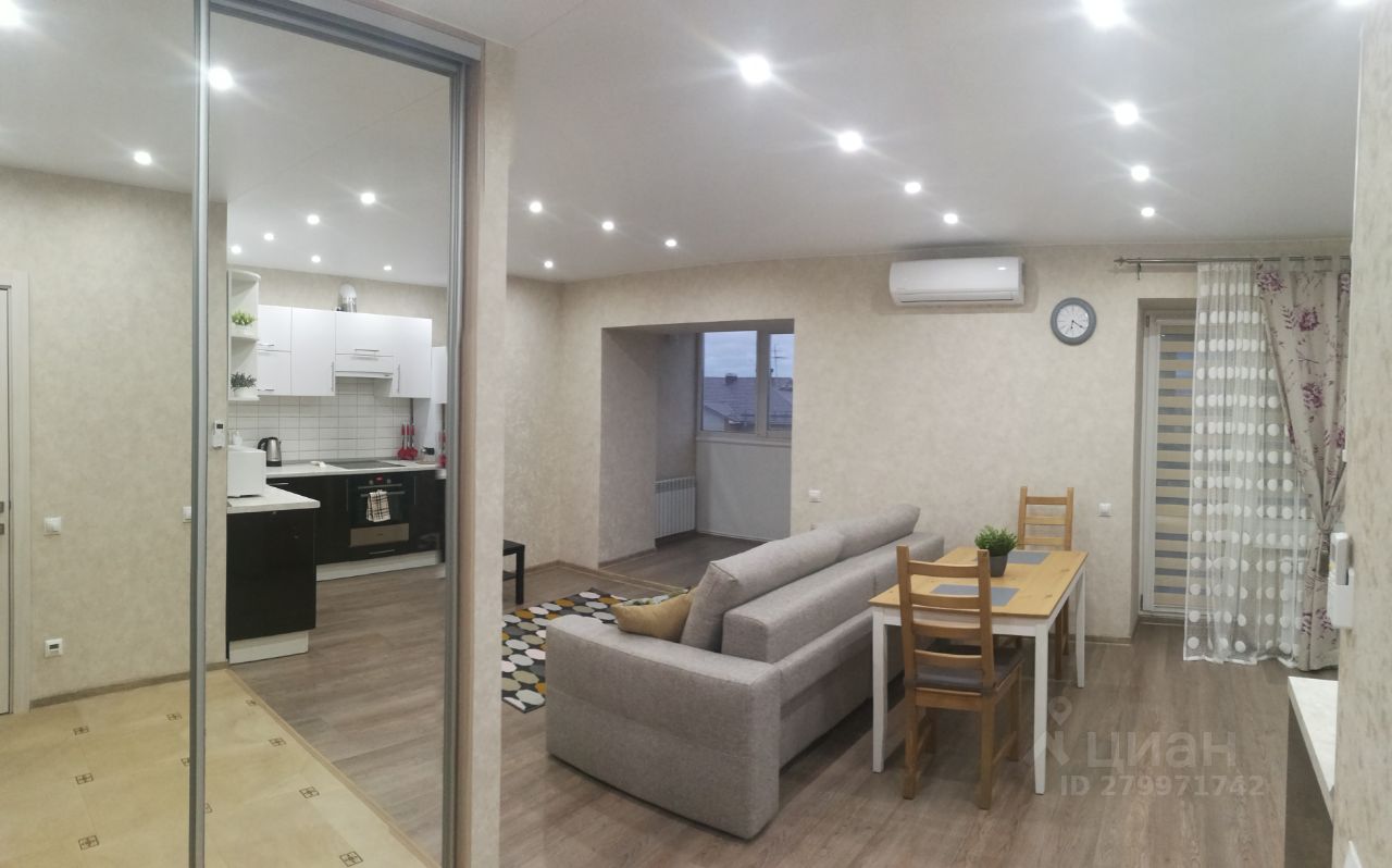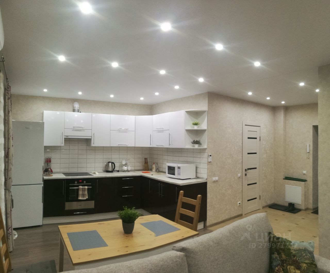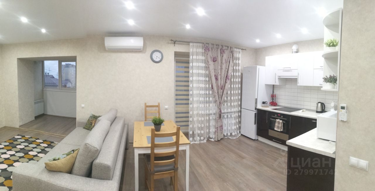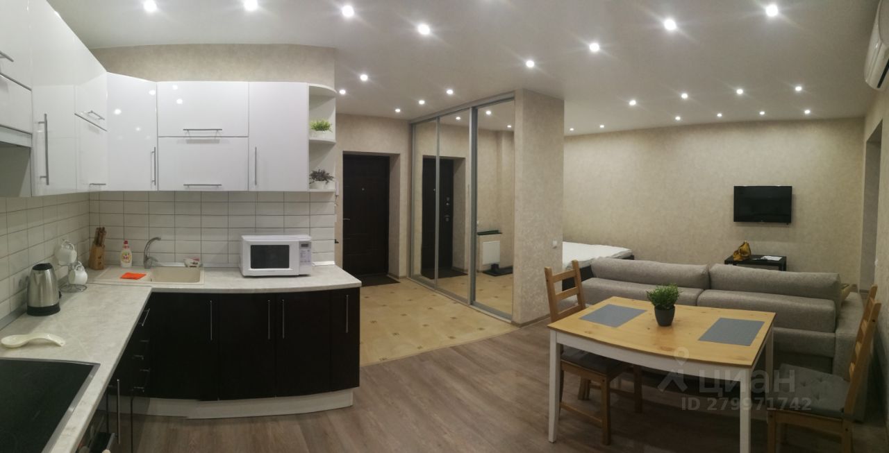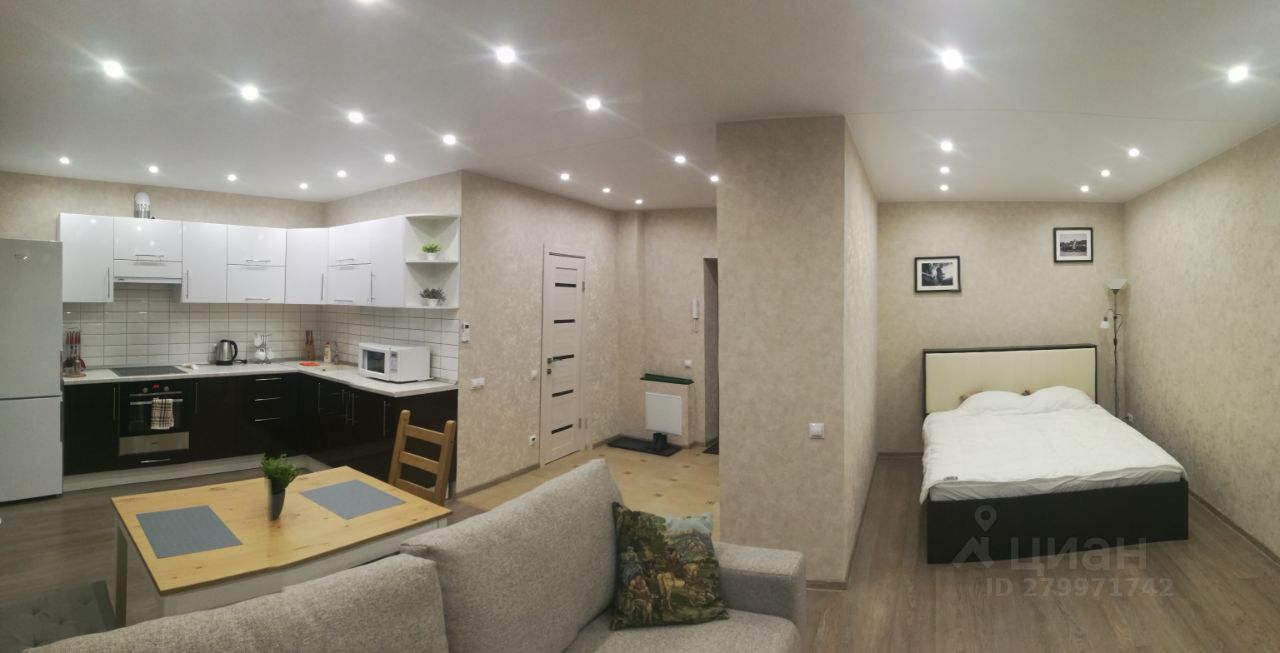 Очень стильная квартира-студия 42,5 кв.м. С выделенными зонами: кухни-столовой, гостиной, спальни и прихожей. Один большой санузел.