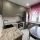 Установлен красивый и качественный кухонный гарнитур, обеденный стол со стульями, создающий полноценную обеденную зону.