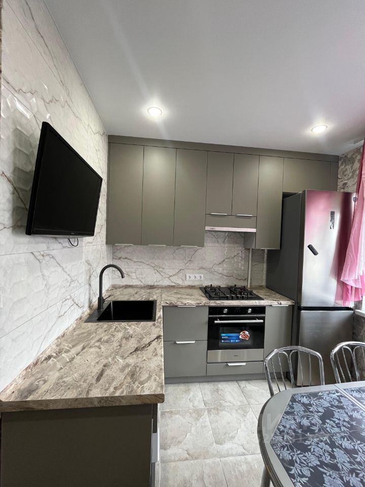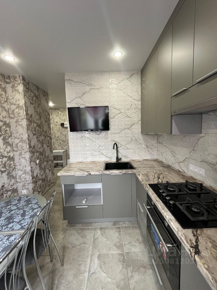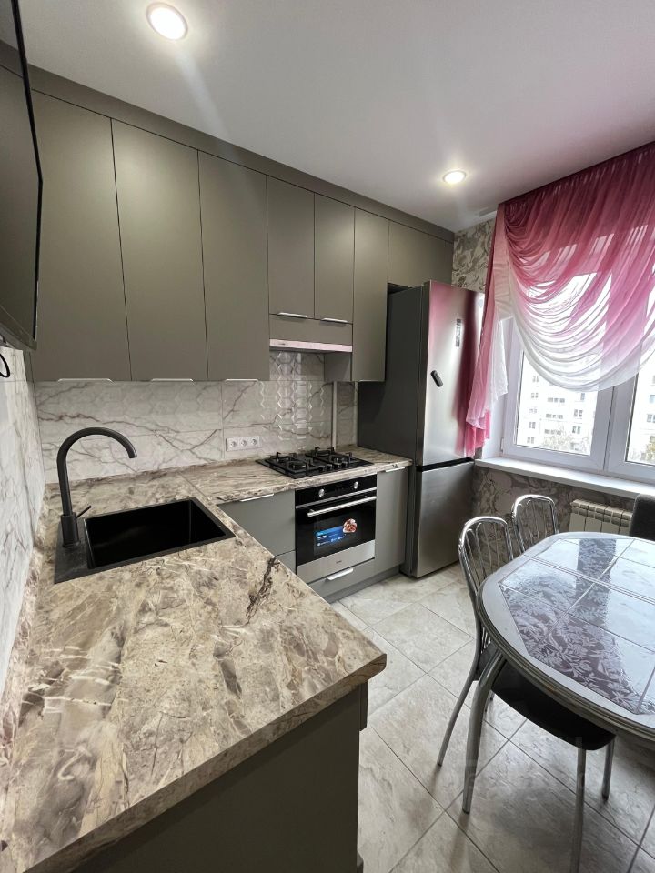 Техника: Всё современное — варочная панель, духовой шкаф, большой холодильник. Для досуга во время готовки есть телевизор.