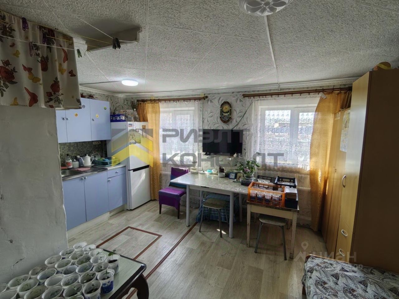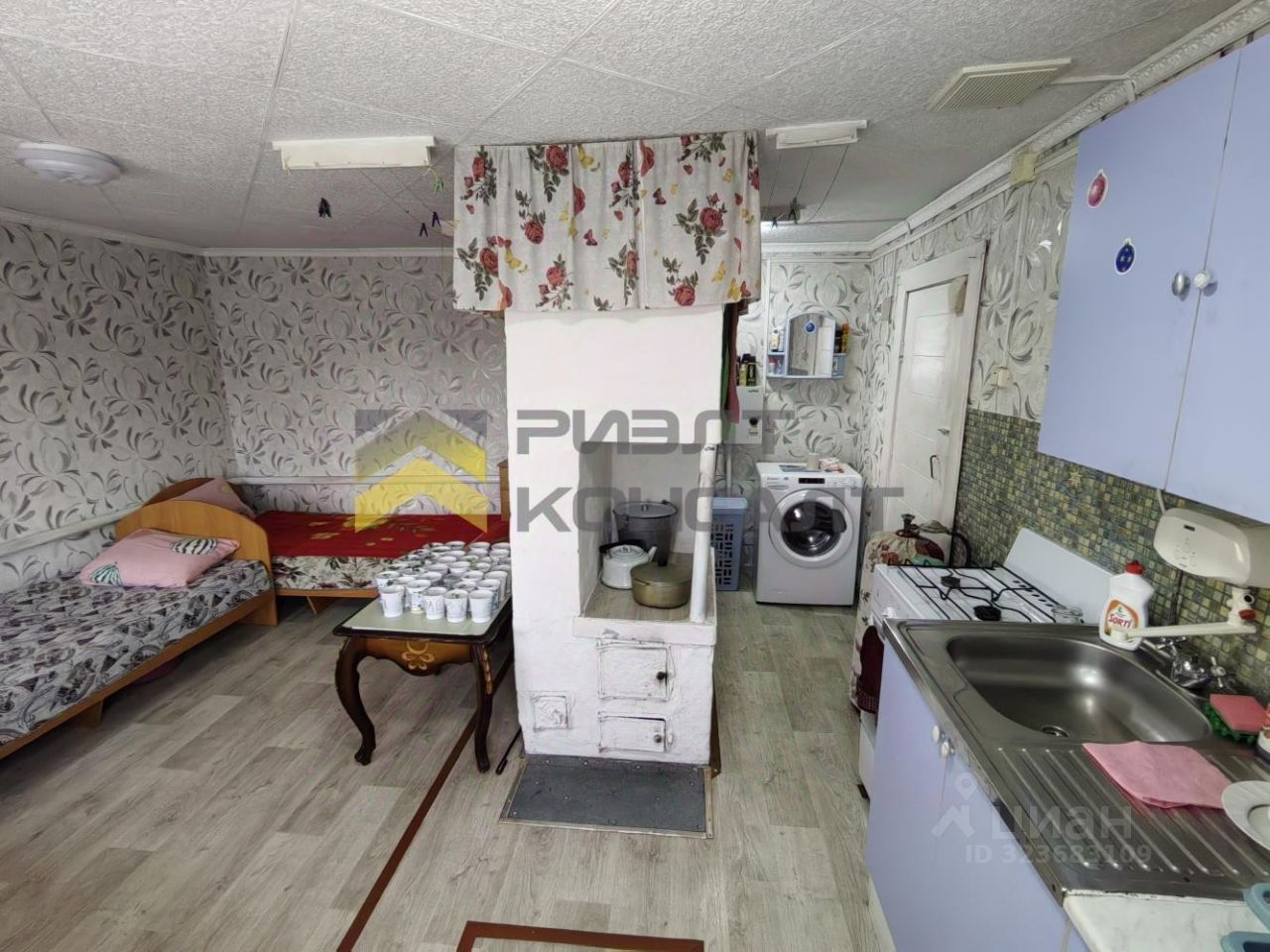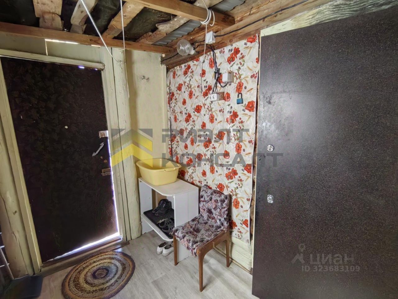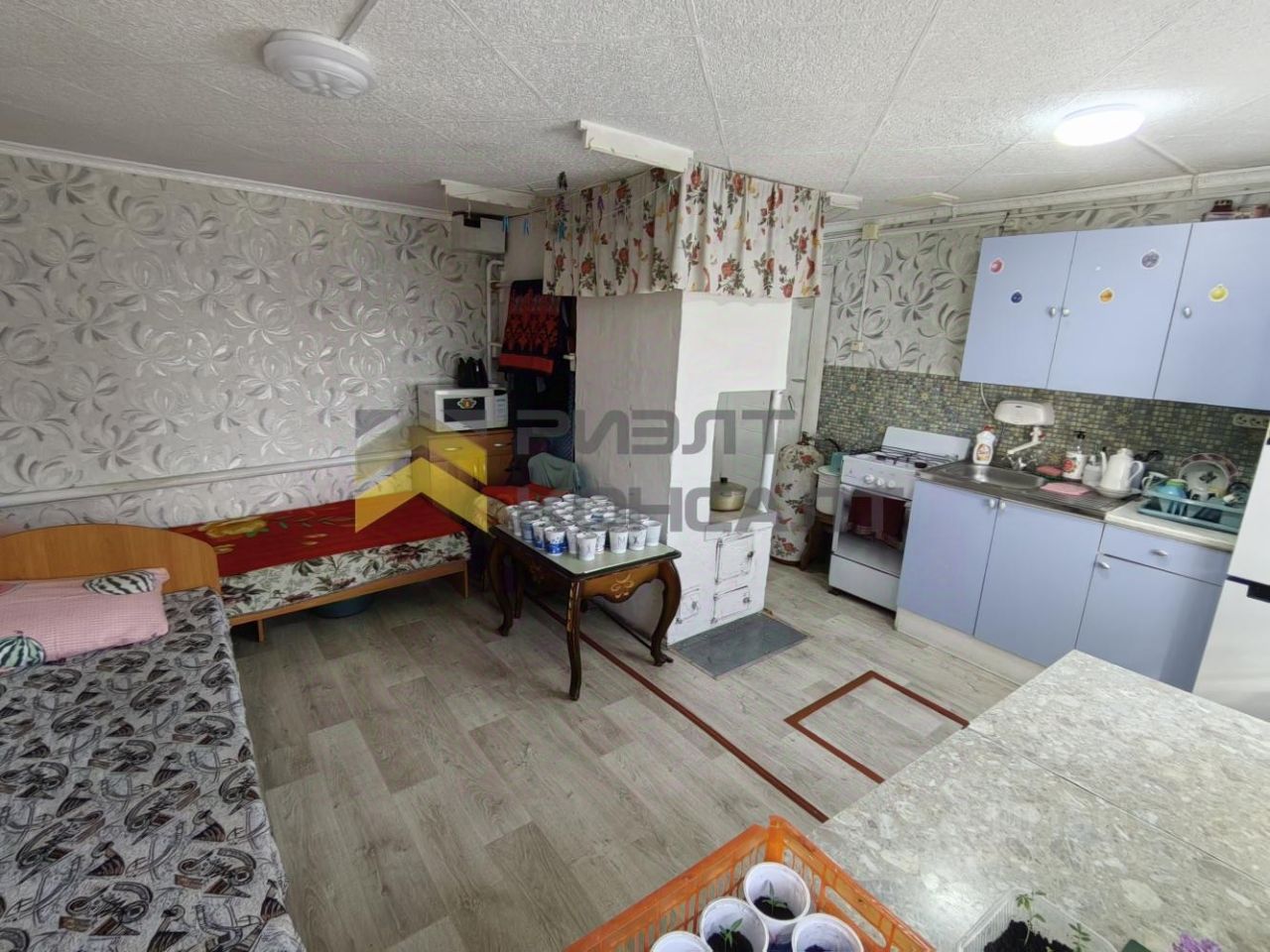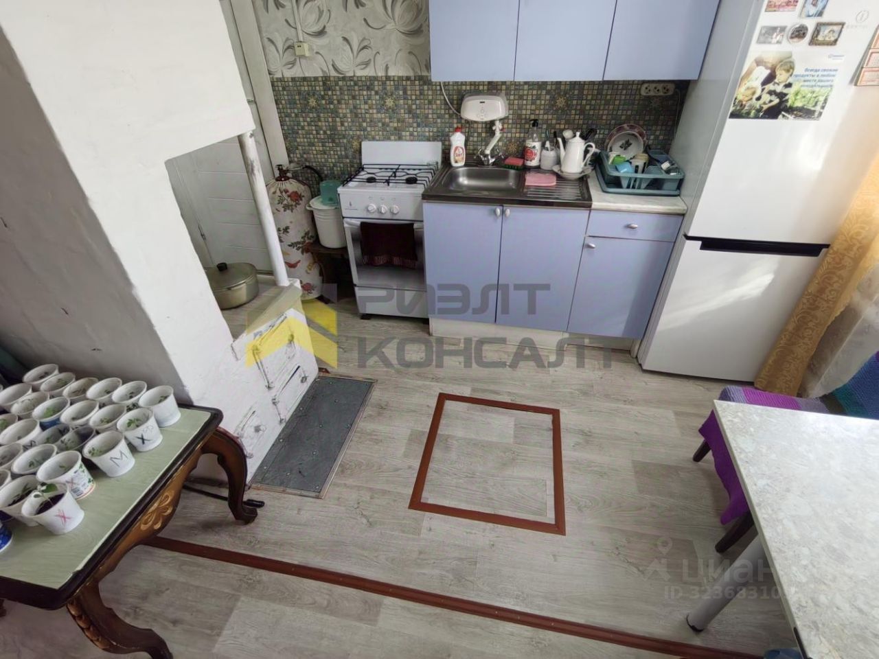 Пол обшит плитами ДСП и застелен линолеумом. В доме есть небольшой погреб, для хранения заготовок и картофеля.