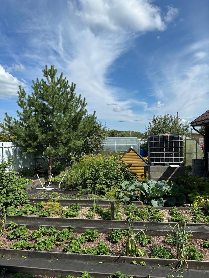 На участке молодые плодовые деревья, есть теплицы, кустарники, многолетние цветы. з сотки отведены для посадки картофеля.