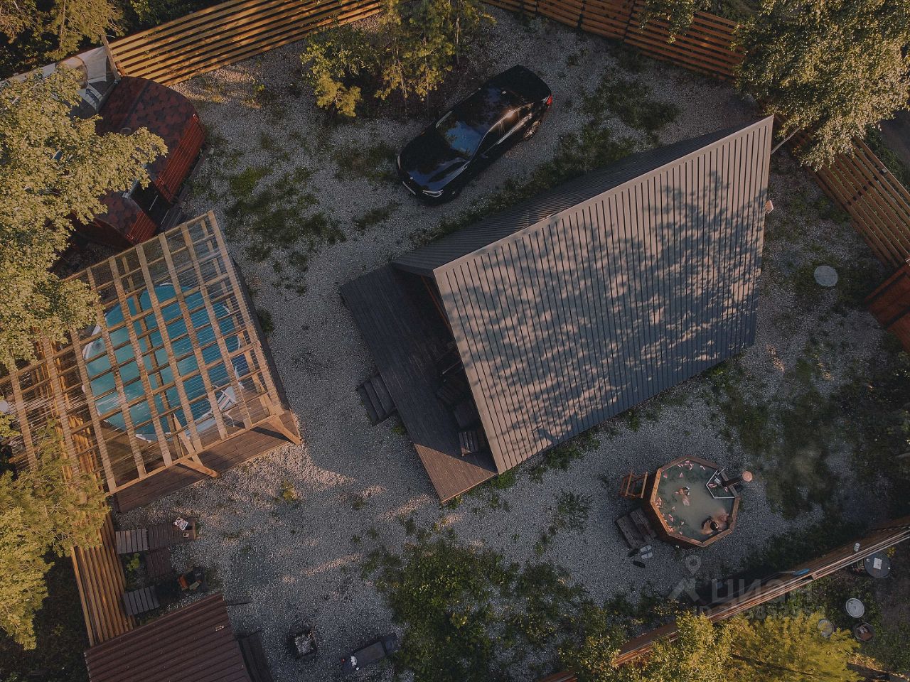 Огражденная территория, беседка, баня, бассейн, мангальная и костровая зоны, качели, банный чан, на каждом доме!