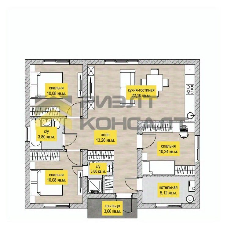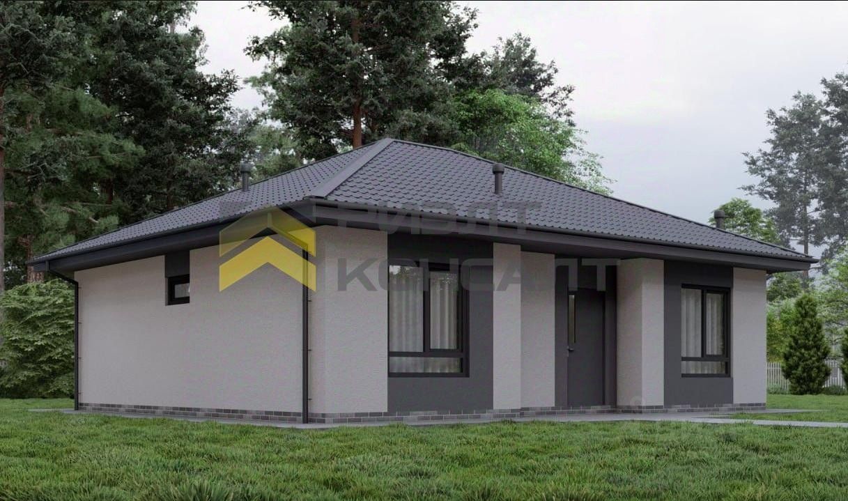 Дом на ленточном фундаменте, из газобетонных блоков 300 с оштукатуренным фасадом. В предчистовую отделку входят: