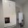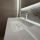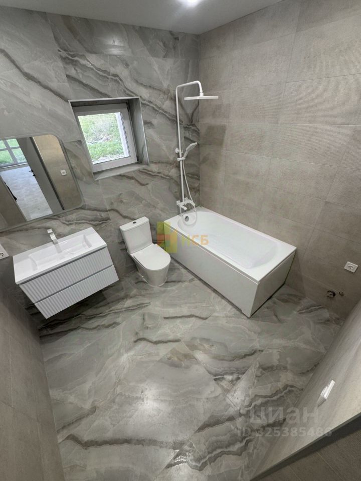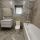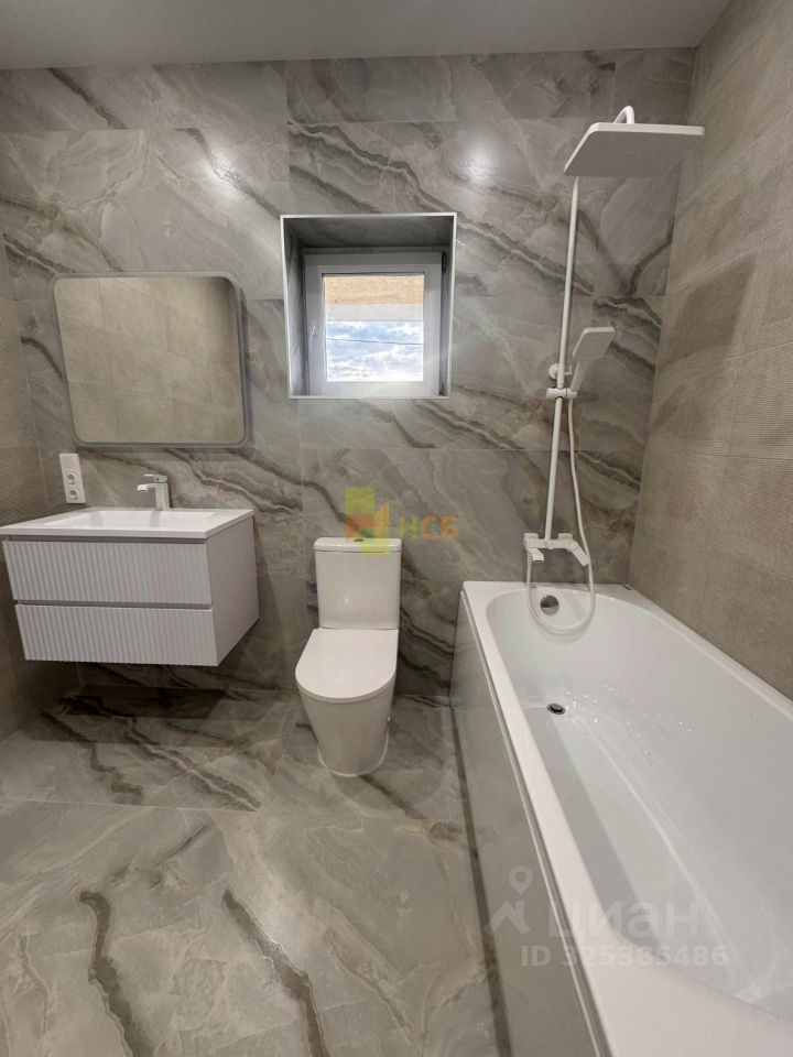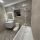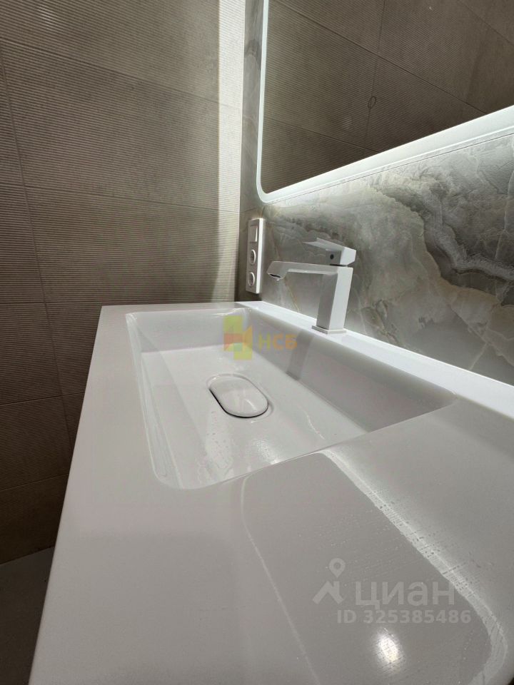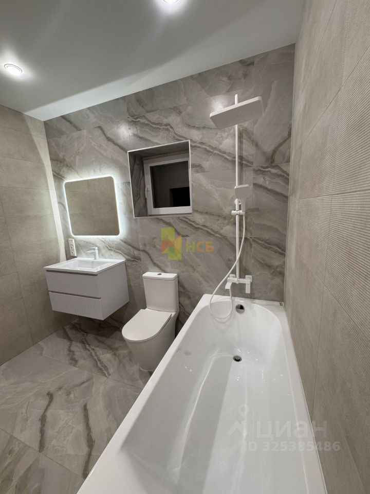 Современный санузел отделан широкоформатным керамогранитом, оснащен новой сантехникой со стильными смесителями и зеркалом с подсветкой.