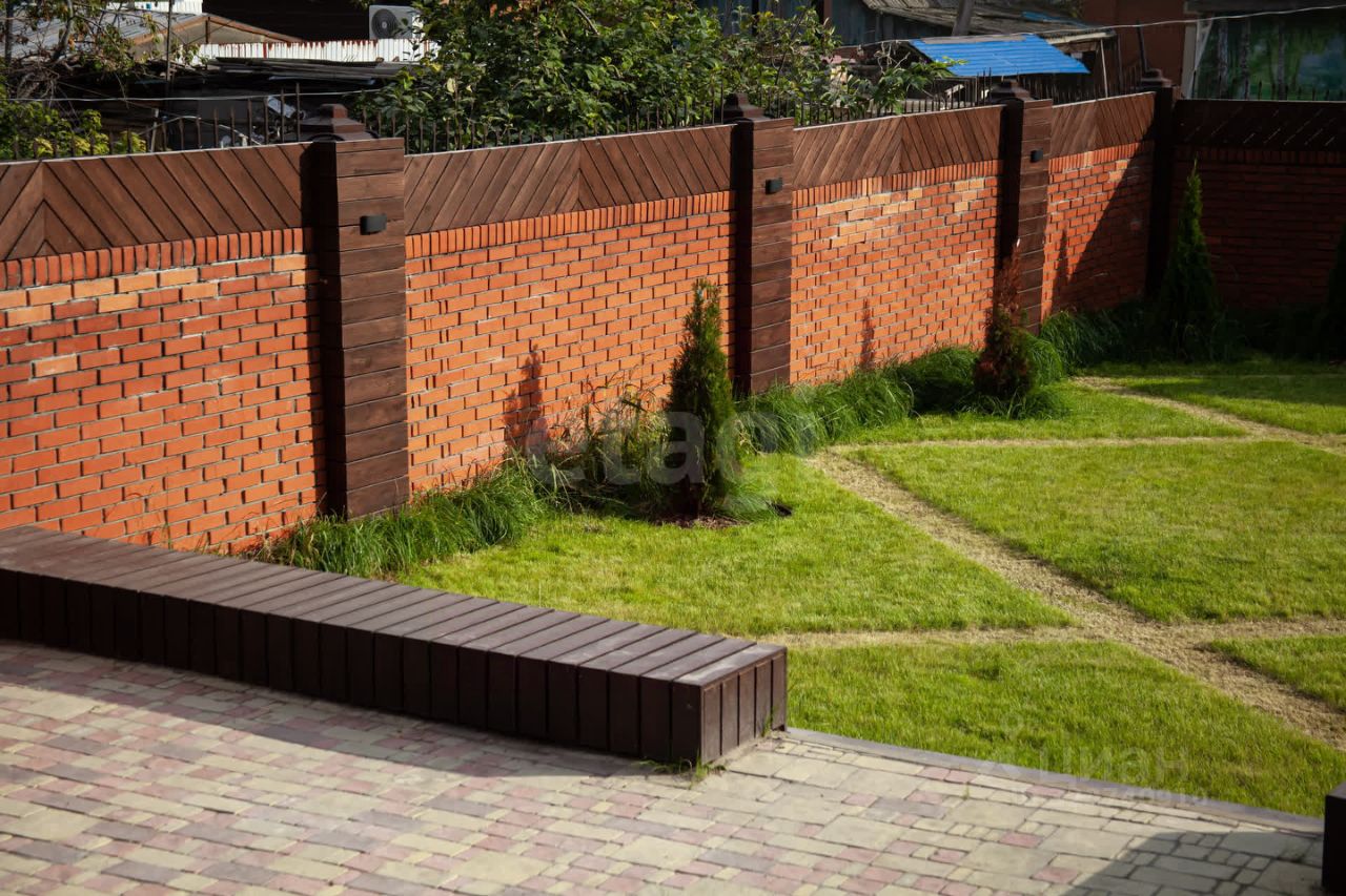 Коттедж построен из кирпича и керамзитоблоков (толщина стен 80 см), фасад декорирован натуральным деревом лиственницы, что придает ему стиль и презентабельность. Капитальный забор с кирпичными столбами, декорированными лиственницей, обеспечивает приватность и безопасность.