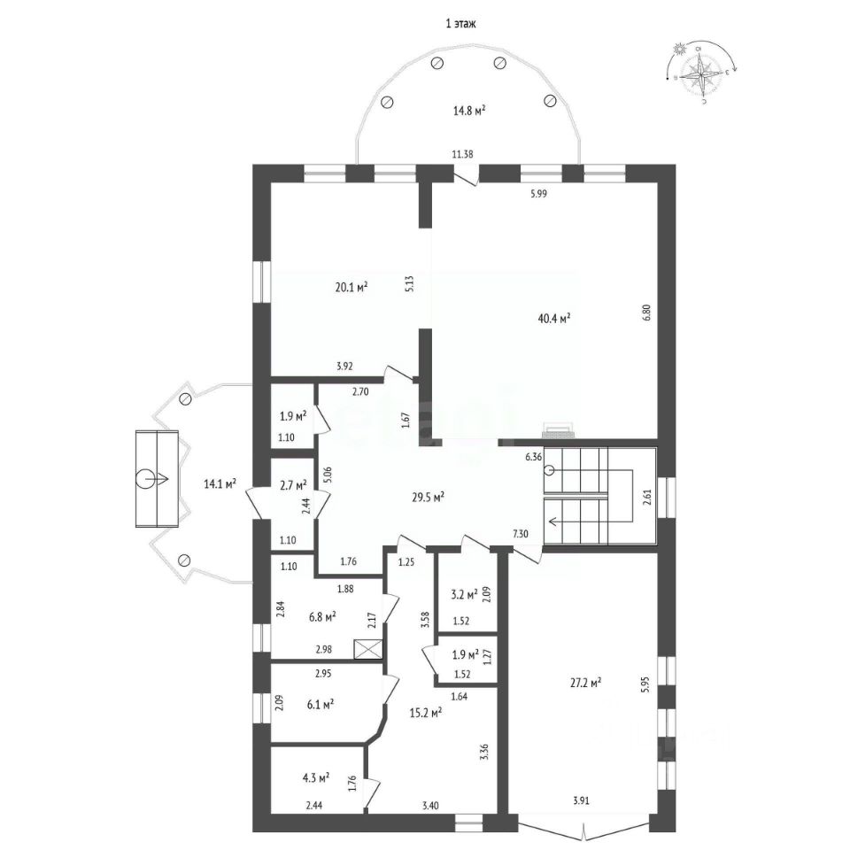 Внутри дома проведено электричество с разводкой по всем комнатам, что облегчает процесс обустройства. К дому подведен газ, централизованная канализация и вода. На первом этаже предусмотрен гараж под машину. Высота потолков 3,3 метра.