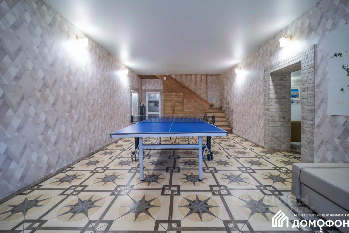 На первом этаже (полноразмерный цоколь) разместилась комната для бильярда, тенниса и тренировок, большая комната для отдыха, санузел, сауна, нагрев которой осуществляется дистанционно, душевая, котельная, построчная, хоз. блок для хранения, а также выход в гараж на две машины и выход на придомовой участок.