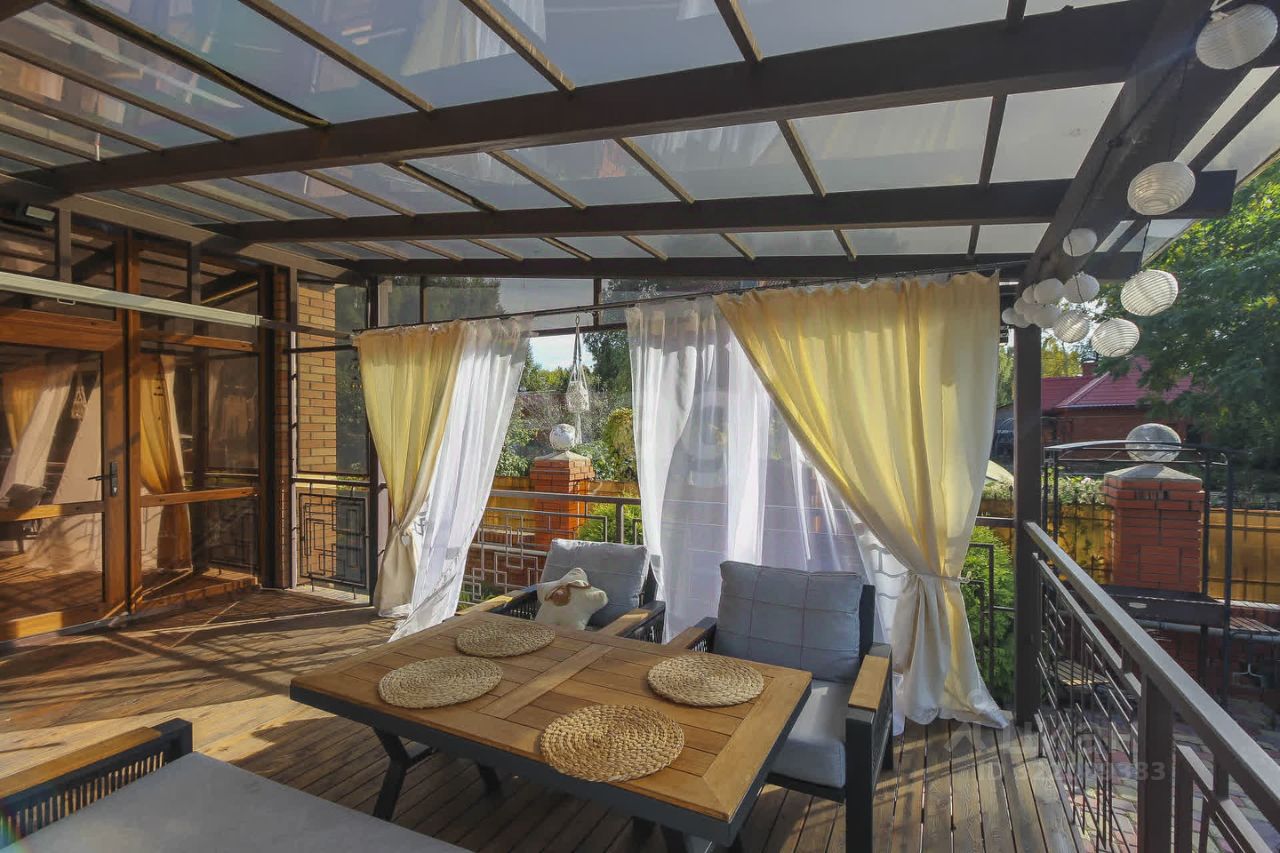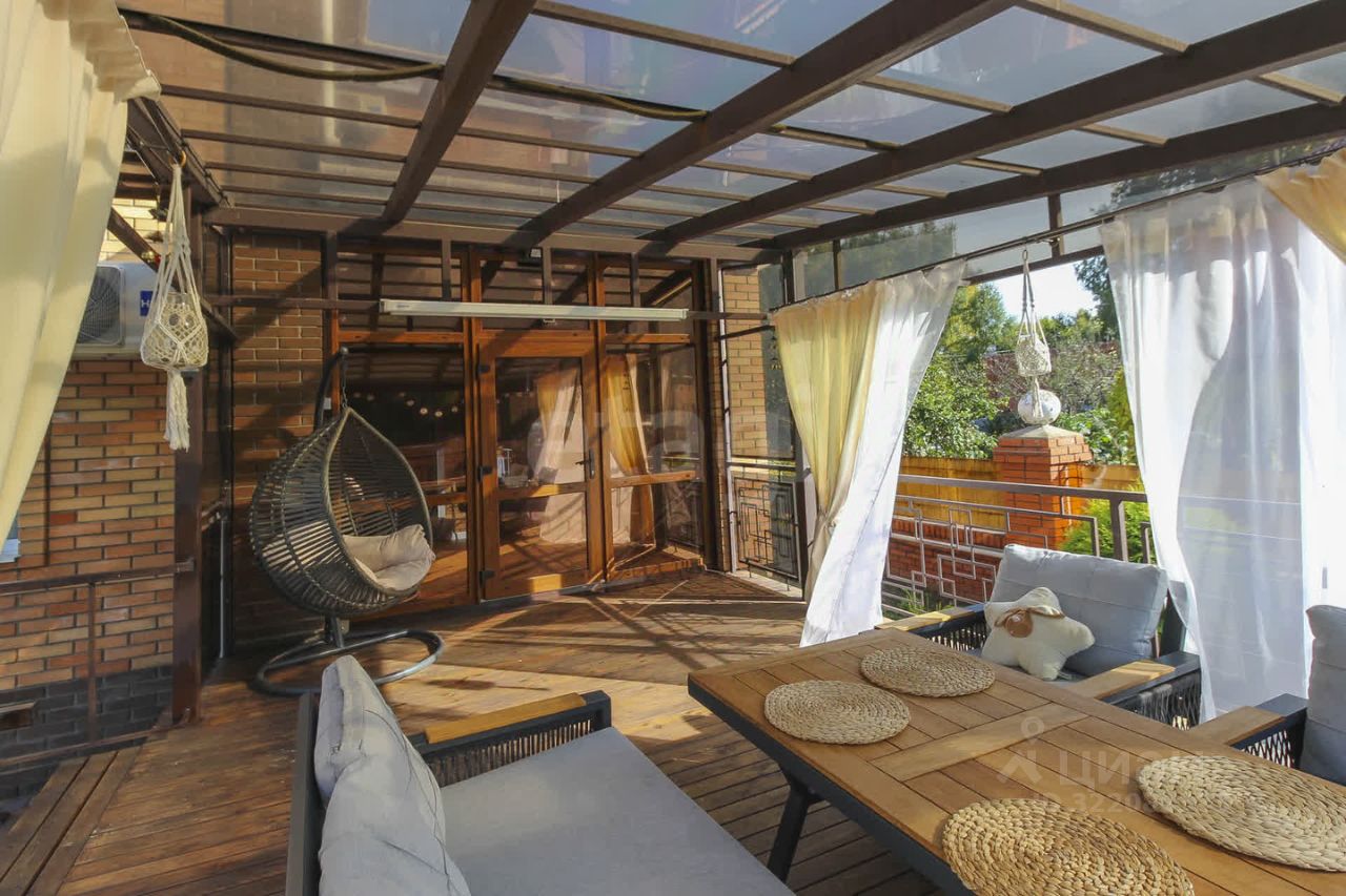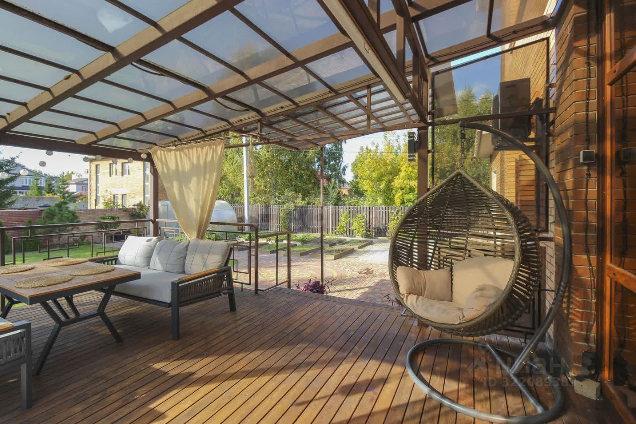 Летняя терраса с выходом из кухни заслуживает отдельного внимания. Она расположена на уровне первого этажа, с обратной стороны дома с видом на зеленую территорию. Это потрясающе уютное пространство оборудовано мягкой зоной отдыха, создано для теплых летних вечеров в кругу родных и друзей и атмосферных завтраков на свежем воздухе.