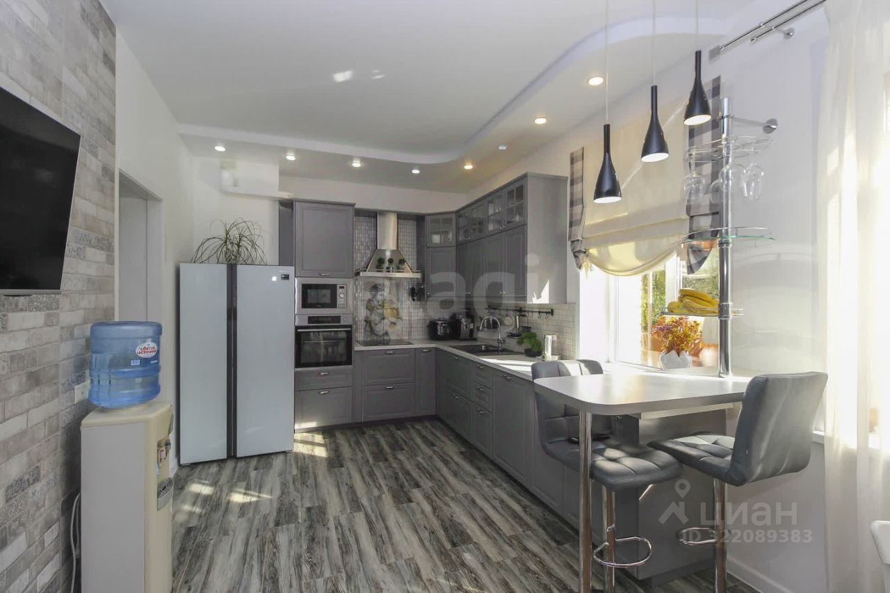 - Просторная кухня, в актуальной цветовой гамме, условно разделенная барной стойкой на зону приготовления и обеденную. Здесь продуман каждый сантиметр: встроенная техника, электрическая плита, духовой шкаф. Кухня имеет выход на зимнюю и летнюю террасу.