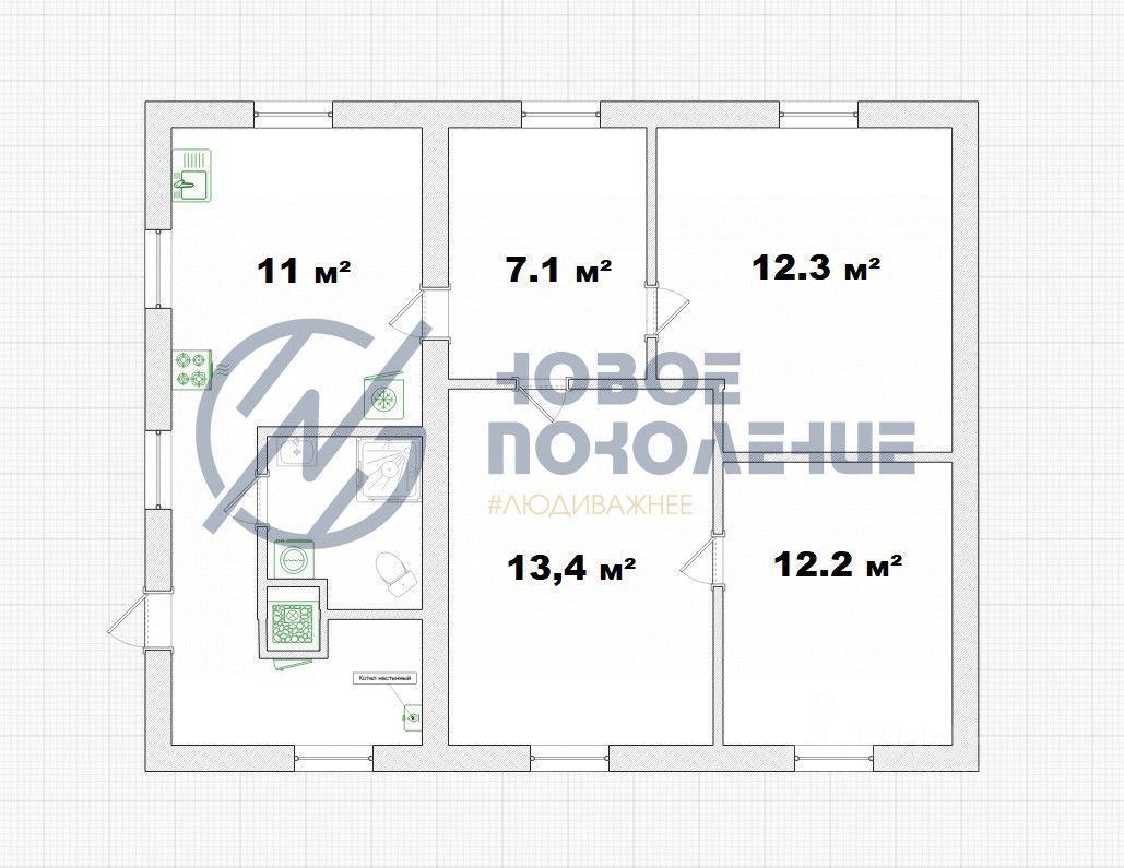ПЛАНИРОВКА дома включает три спальни, гостиную, просторную кухню, совмещённый санузел, котельную.