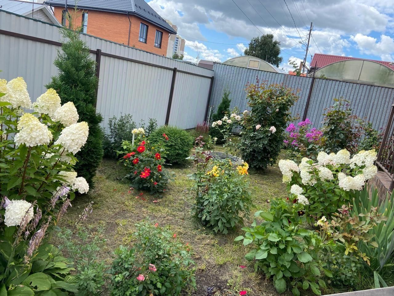 Цветы , гортензии, хризантемы многолетние, флоксы, ирисы, лилейники, розы-8 кустов.