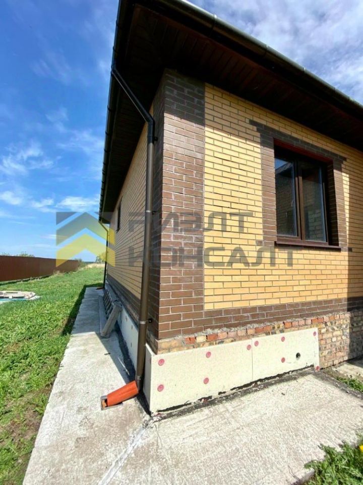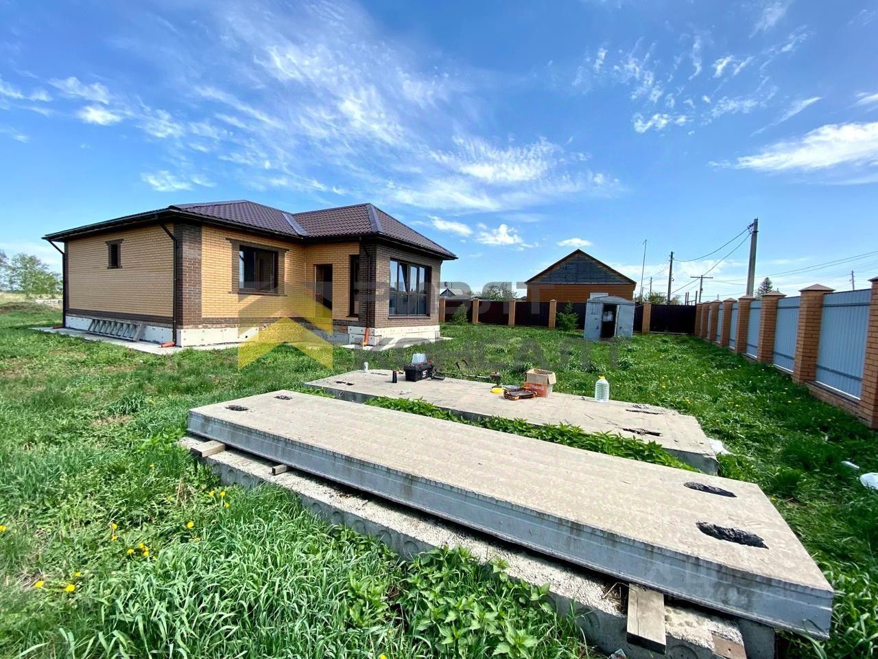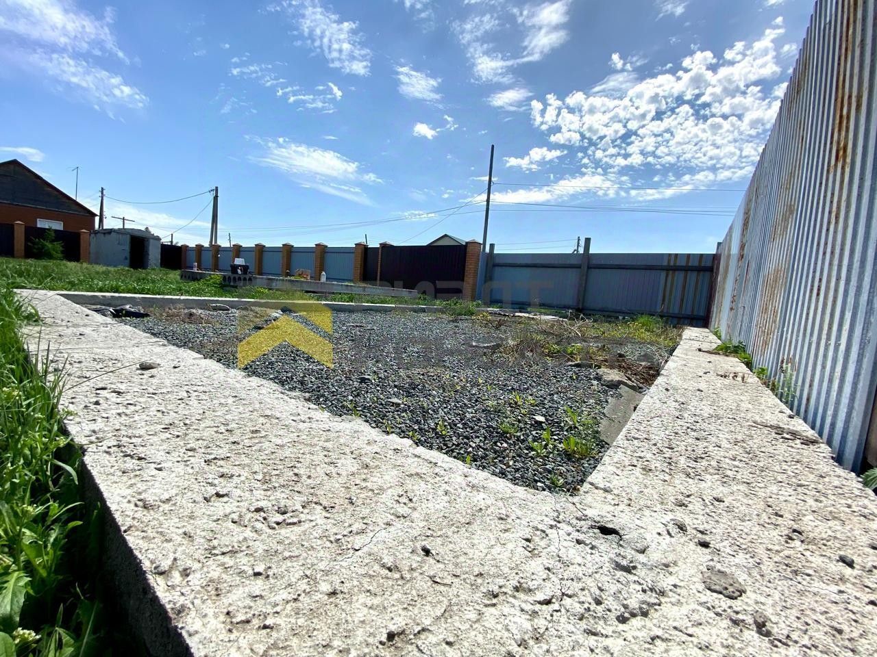 Фундамент ленточный, выполнен с армопоясом и утеплённой отмосткой. На участке также подготовлен фундамент под гараж с плитами перекрытия.
