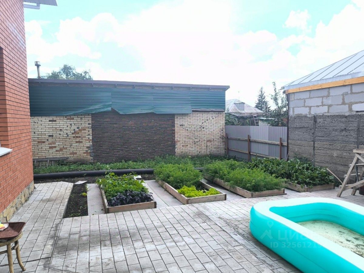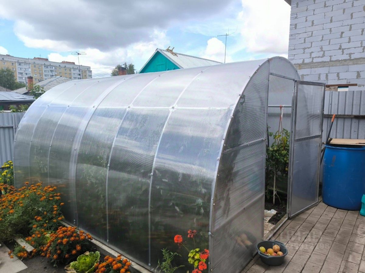 Участок размером 4 сотки огорожен. Собственный двор выложен брусчаткой, есть огород с теплицей и детская площадка,