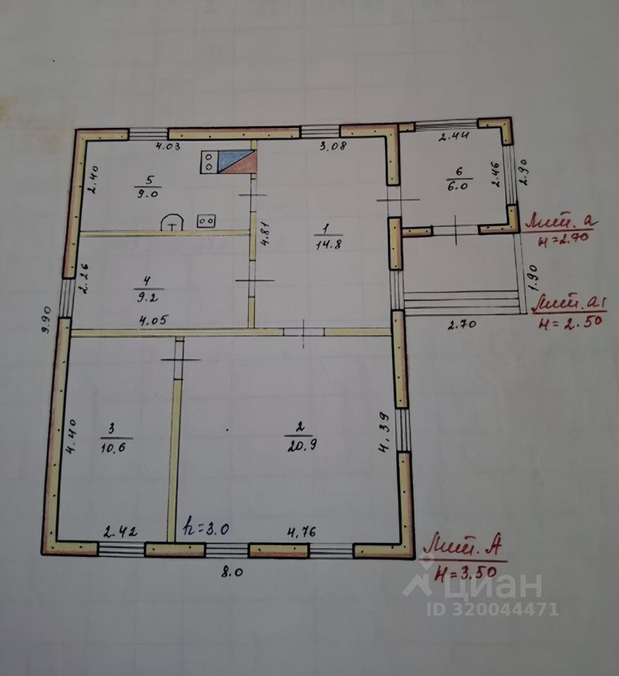 В планировку дома входят: просторный зал 20,9кв. М, две спальни 10,6 и 9,2 кв. М, кухня 9кв. М, санузел, большая прихожая 14,8кв. М, веранда 6кв. М.