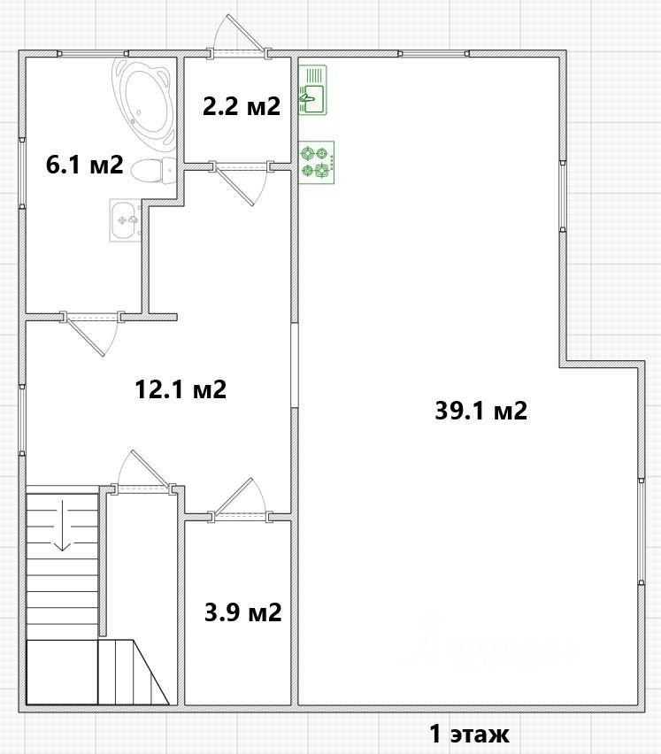 Первый этаж дома площадью 65,2 кв.м состоит из гостиной-кухни 39,1 кв.м, прихожей, ванной с с/узлом, коридора, щитовой и кладовой комнат.