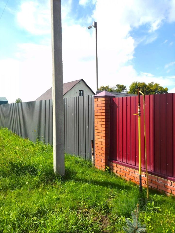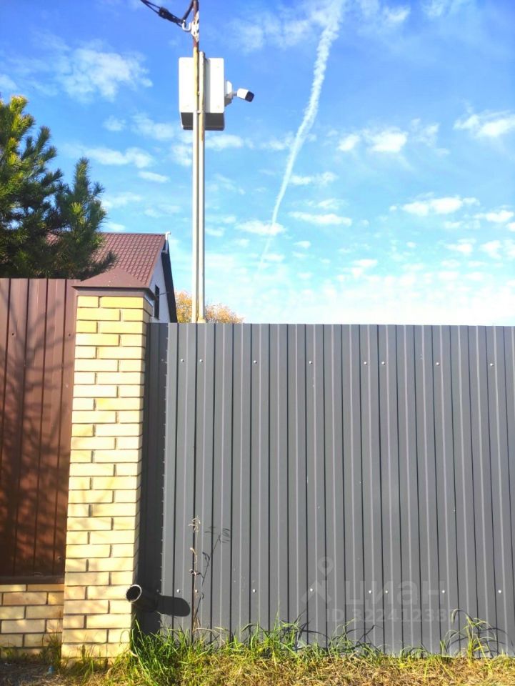 Огорожен забором с калиткой и распашными воротами.