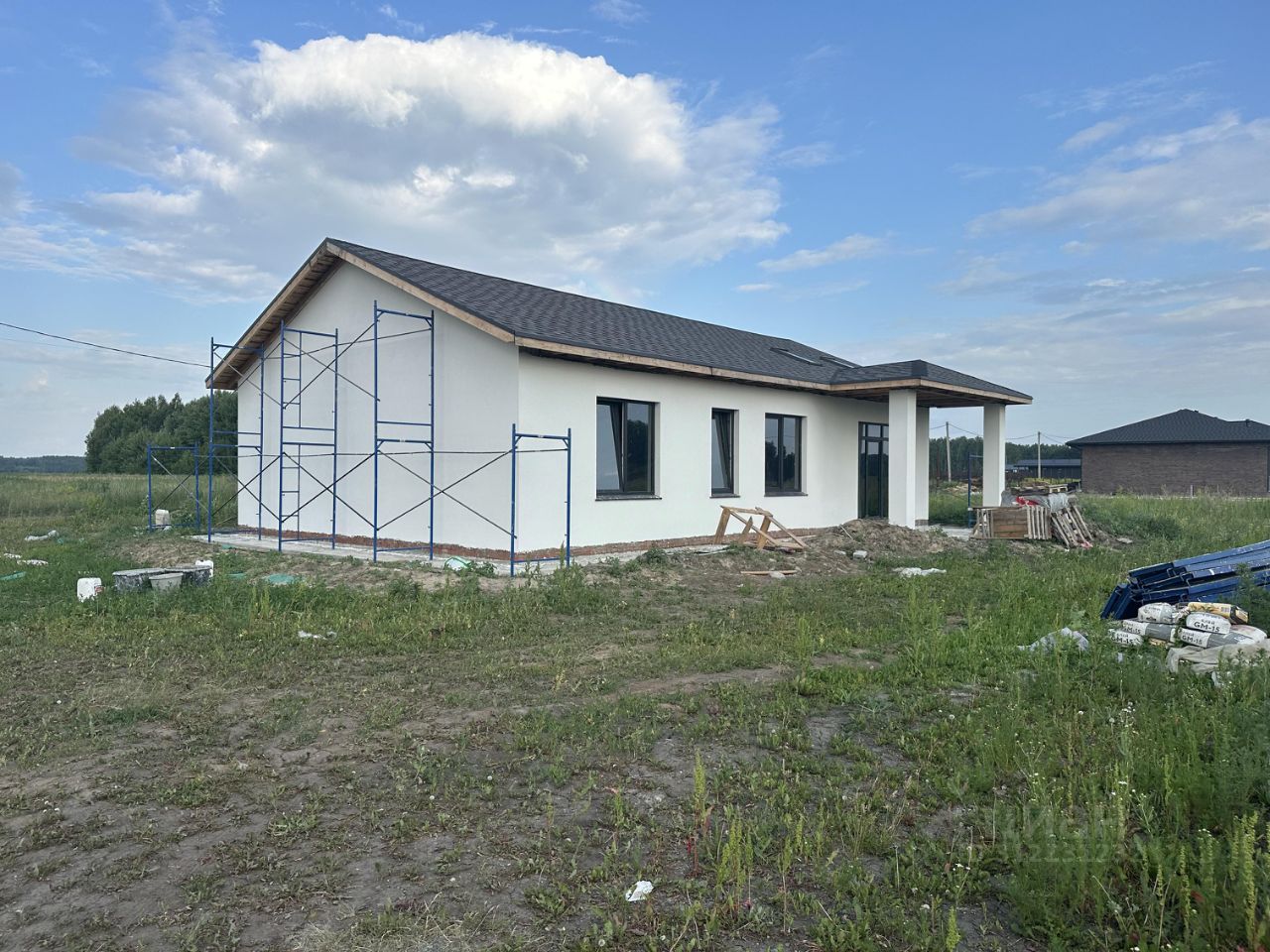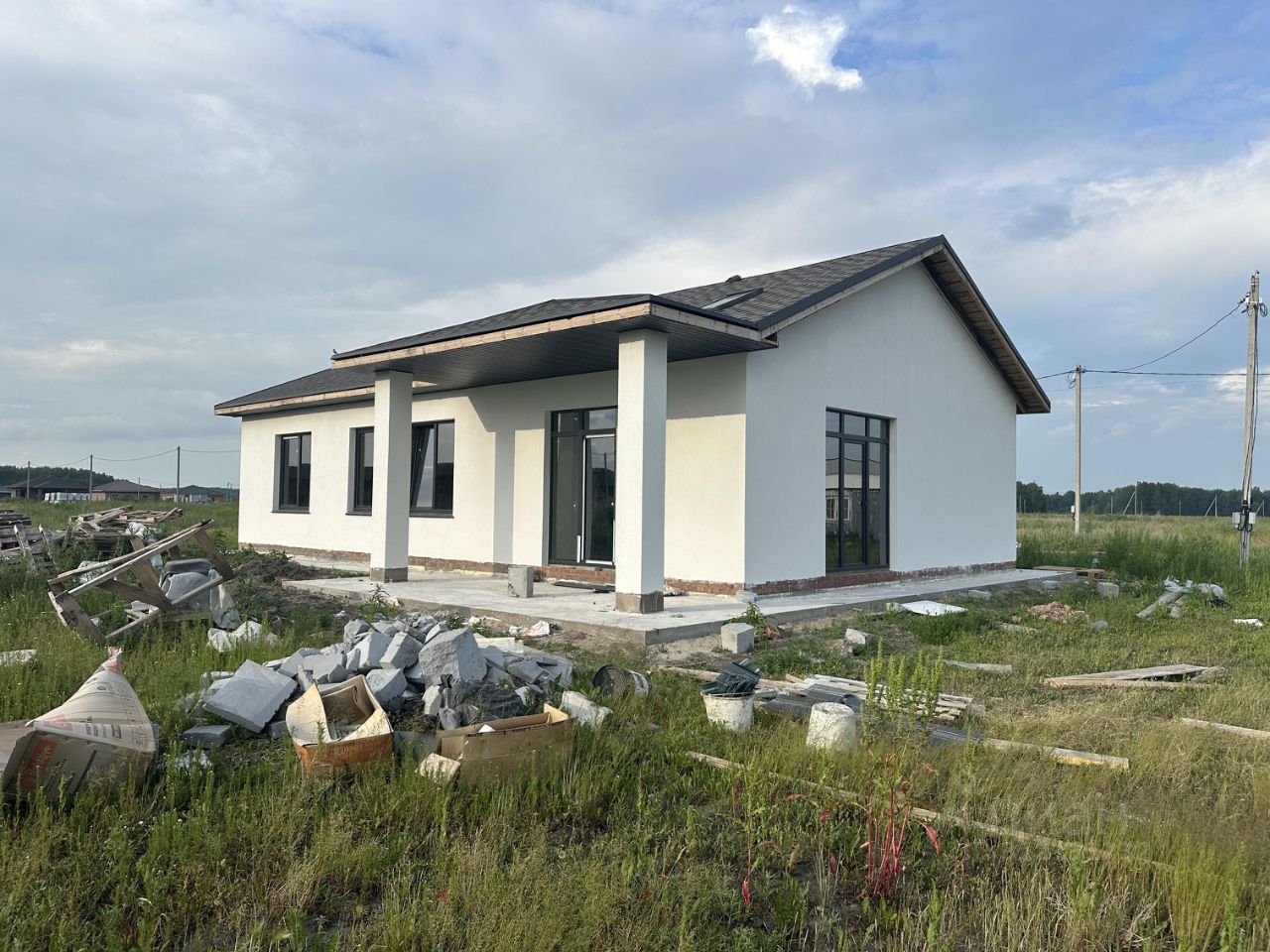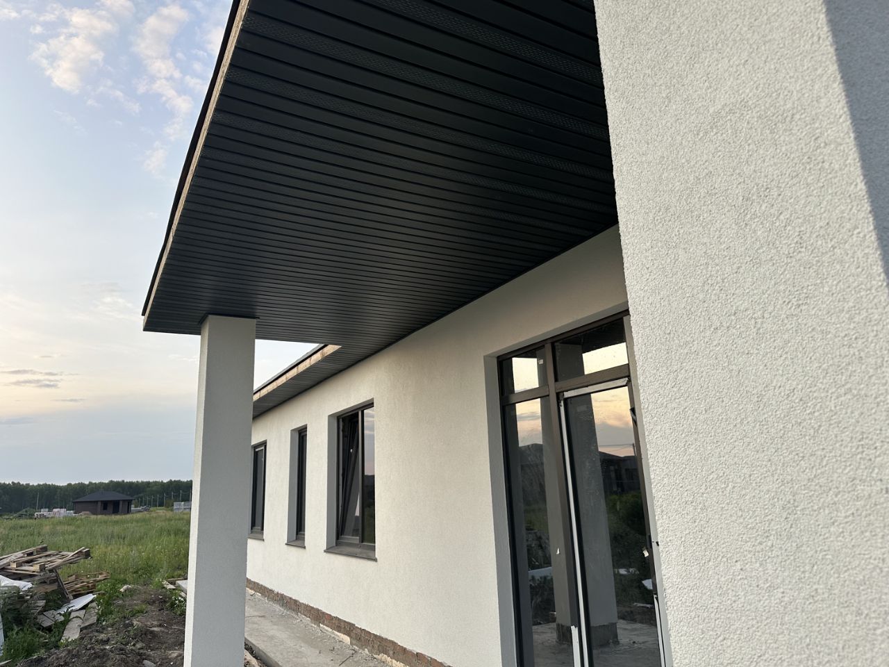 Фундамент дома - утепленная монолитная плита, толщиной 30 см.Стены выполнены из газобетона толщиной 40 см, что не требует дополнительного утепления стен. Перегородки также газоблок 10 см. Кровля выполнена полностью из премиальных материалов - мягкая черепица, утепление 20 см ватой. Окна - 2 окна в гостиной панорамные пластиковые с ламинацией. Произведена предчистовая штукатурка внутренних стен. Наружная чистовая декоративная штукатурка шуба. Металлическая входная дверь с терморазрывом и смотровым окном.