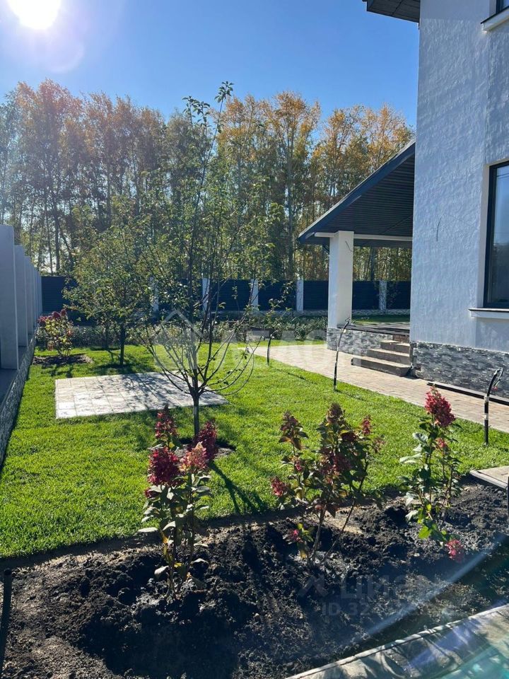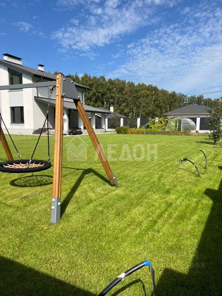 На территории , кроме основного строения, расположены баня, бассейн с подсветкой и подогревом, детская и спортивная площадки. Участок (13 соток в собственности) огорожен забором. Ворота автоматические. По периметру забора установлены камеры видео наблюдения. Выполнен ландшафтный дизайн участка. Дорожки вымощены тротуарной плиткой. Большая часть территории засеяна газоном. Посажены многолетние плодово-ягодные культуры, организовано место для однолетних растений. Система авто полива. Имеется навес, примыкающий к дому (на два автомобиля).