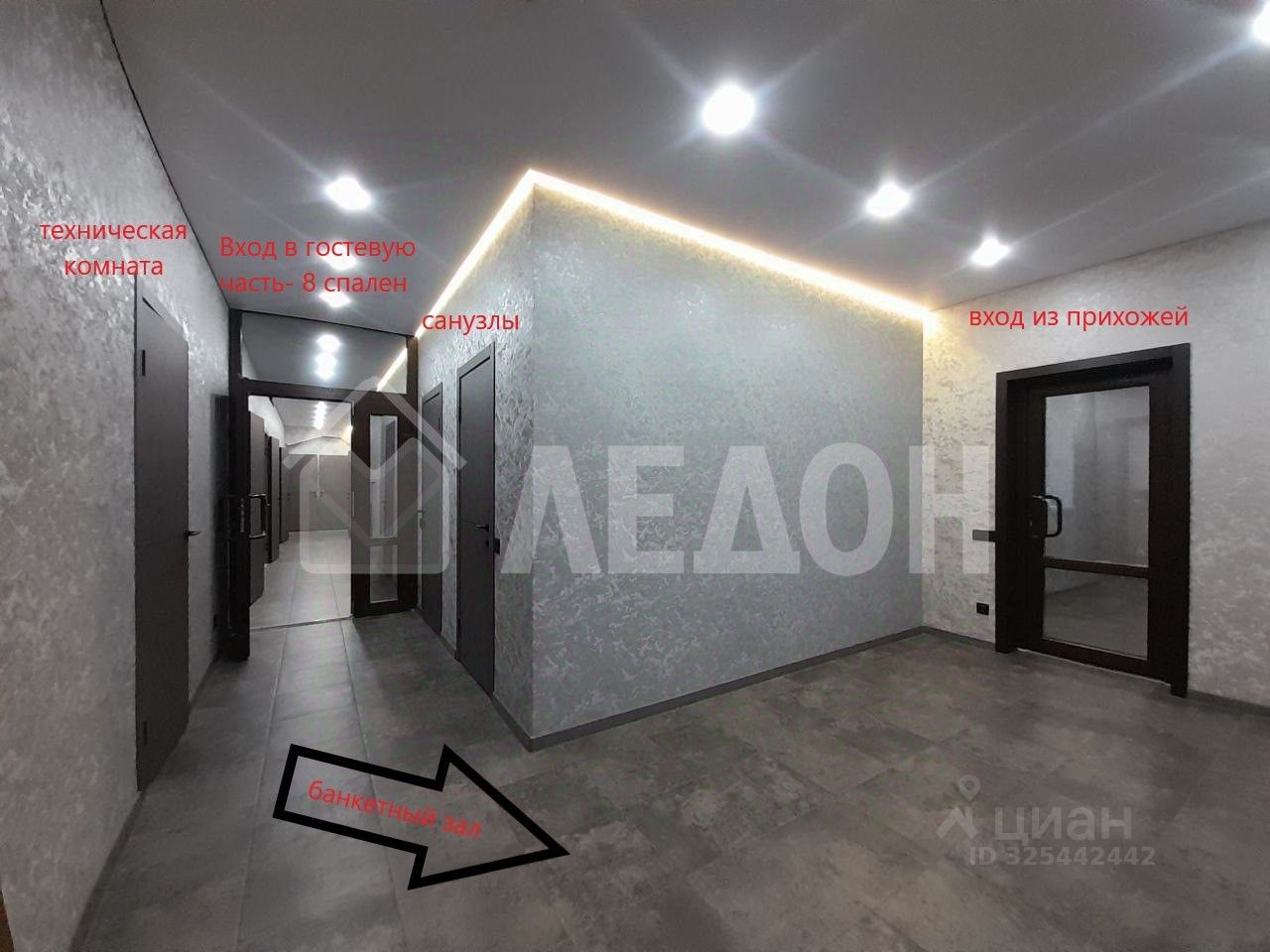 Включает в себя банный комплекс , Гостиную-банкетный зал, кухню и 8 спален
