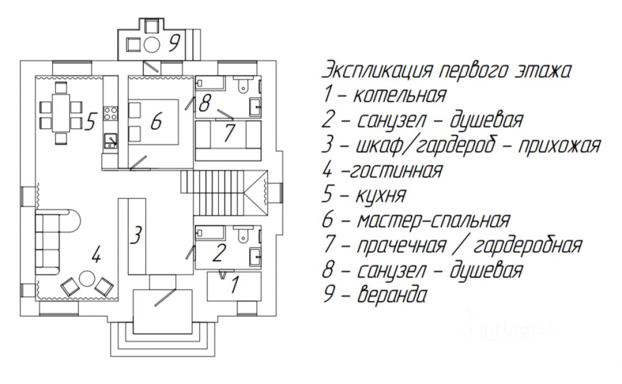1 этаж: Просторная входная группа с зоной отдыха, просторная функциональная кухня-гостиная, зона спа (состоящая из сауны, душевой, каминной зоны и уличной веранды), гардеробная.