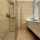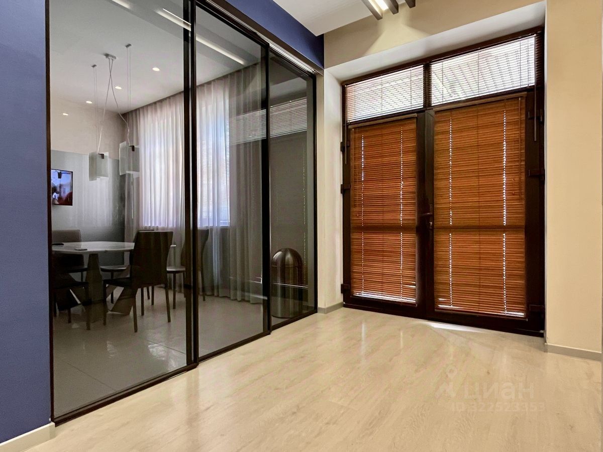- Первый этаж: просторная входная группа с встроенным шкафом-купе, кабинет, современный санузел с итальянской плиткой и сантехникой, кухня, отделенная стеклянной перегородкой, и большая гостиная с выходом на застекленную террасу.