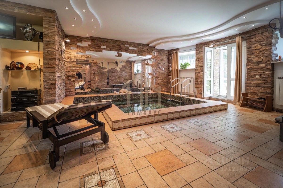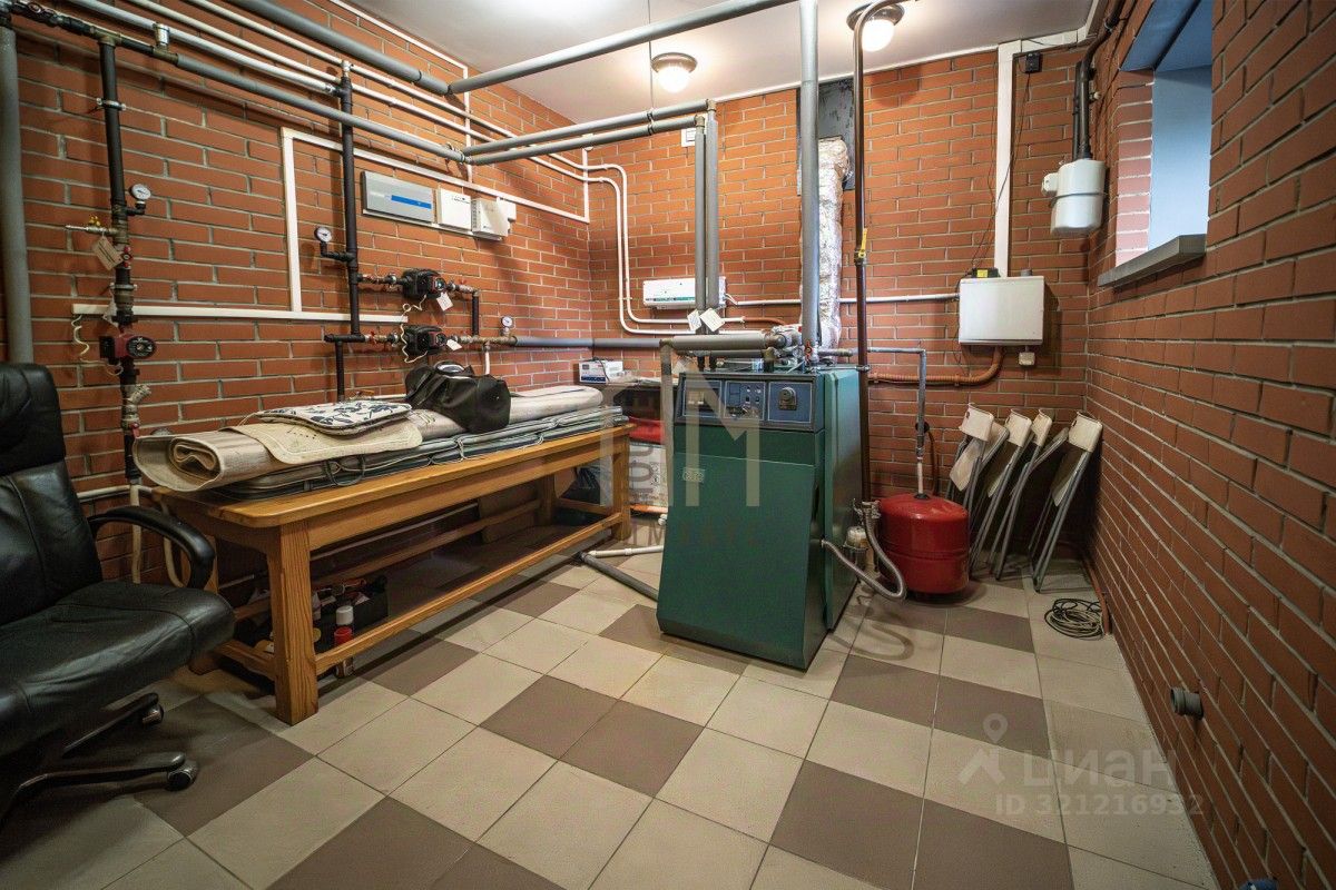 Цокольный этаж — это настоящий оазис для отдыха с бассейном, сауной, душевой и санузлом. Также здесь располагается гараж на 2 автомобиля, винный погреб и хозблок. Все коммуникации: свет, центральный водопровод, центральная канализация и газ. Газовый котел импортного производства способен отапливать до 1000 м², а в качестве резерва установлен электрокотел.