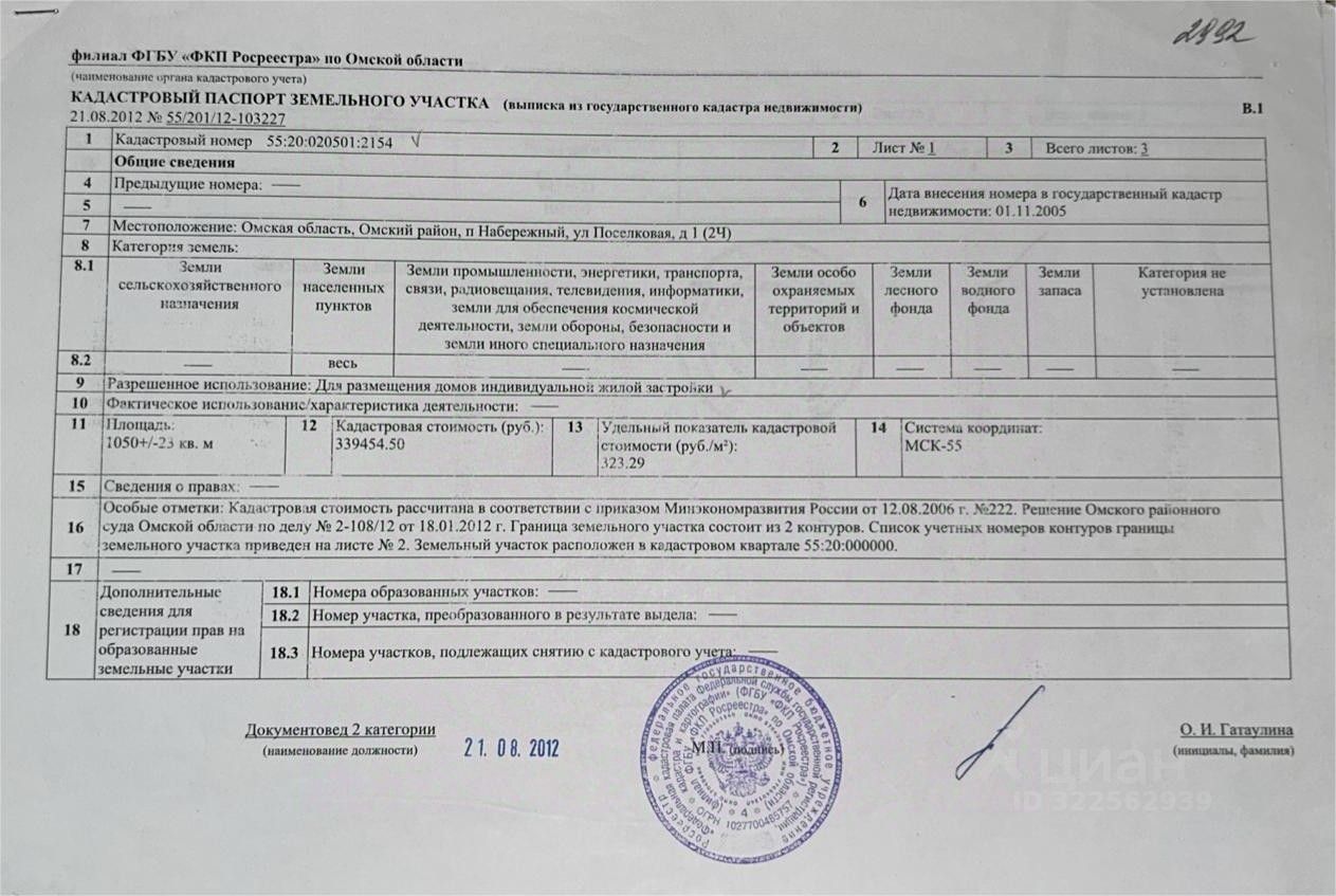 Для любителей уединённой загородной жизни в близи реки Иртыш, продаётся земельный участок и часть дома, не далеко от города, п. Набережный 2 км. от Ачаирского монастыря, центральная улица Поселковая, при везде с трассы М 38 (Черлакский тракт), Удачное место расположения: 200 метров от берега Иртыша, сухая широкая улица, всего на 11 домов. Земельный участок 1050 кв.м. состоит из двух отдельных участков (контуров) 943 кв.м и 107 кв.м., проведено межевание. Категория земель: Земли населённых пунктов. Вид разрешённого использования: Для индивидуальной жилой застройки. На участке 943 кв.м. , который находится в стороне, строения отсутствуют, можно построить дом где не будет видно соседских домов. Рядом с участком 107 кв.м. находится жилой дом 1960 г.п. на трёх хозяев, собственность не долевая, оформлено как части с отдельными входами и независимым отоплением (согласие соседей на продажу не требуется, преимущество права покупки у соседей отсутствует). Часть дома 2 общей площадью 20.1 кв.м., состоит из двух комнат: 12,8 кв.м. и 7,3 кв.м., состояние удовлетворительное. В посёлке проведён газ, водопровод. Через трассу на против п. Речной (СП Ачаирское Омского района) есть школа, дет. сад, магазины, районная больница. Рядом остановка, транспорт круглый год, автобусы: 326, 1161, маршрутные такси: 325,507,905. Документы готовы. Возможен быстрый выход на сделку. Один взрослый собственник. Несовершеннолетних нет. Обременений нет.