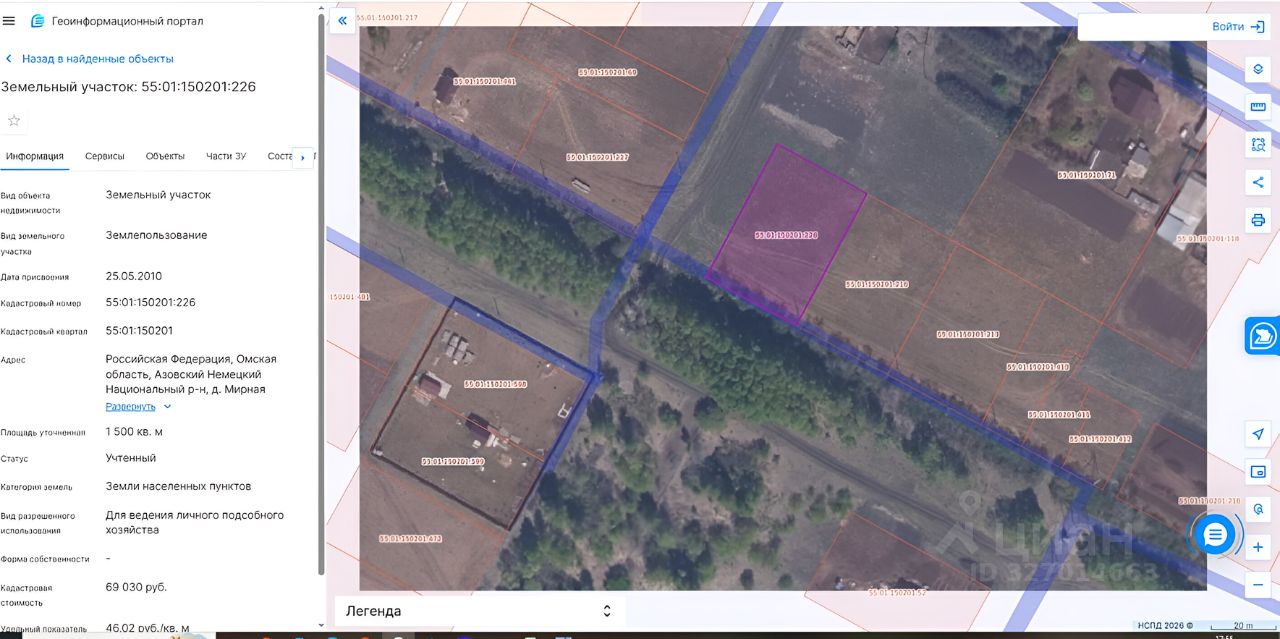 Земельный участок с кадастровым номером 55:01:150201:226, площадью 1500 +/- 27 кв. м., расположенный по адресу: Российская Федерация, Омская область, Азовский Немецкий Национальный р-н, д. Мирная Долина, ул. Садовая