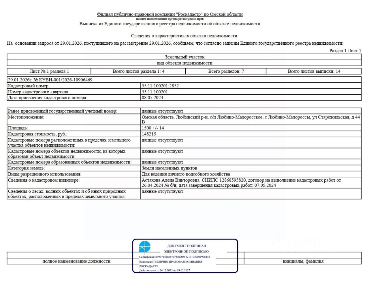 Земельный участок из земель населенных пунктов, расположенный по адресу: Омская область, Любинский район, с. Любино-Малороссы, ул. Старожильская, д. 44В, площадью 1500 кв.м, с кадастровым номером 55:11:100201:2852, вид разрешенного использования: для ведения личного подсобного хозяйства.