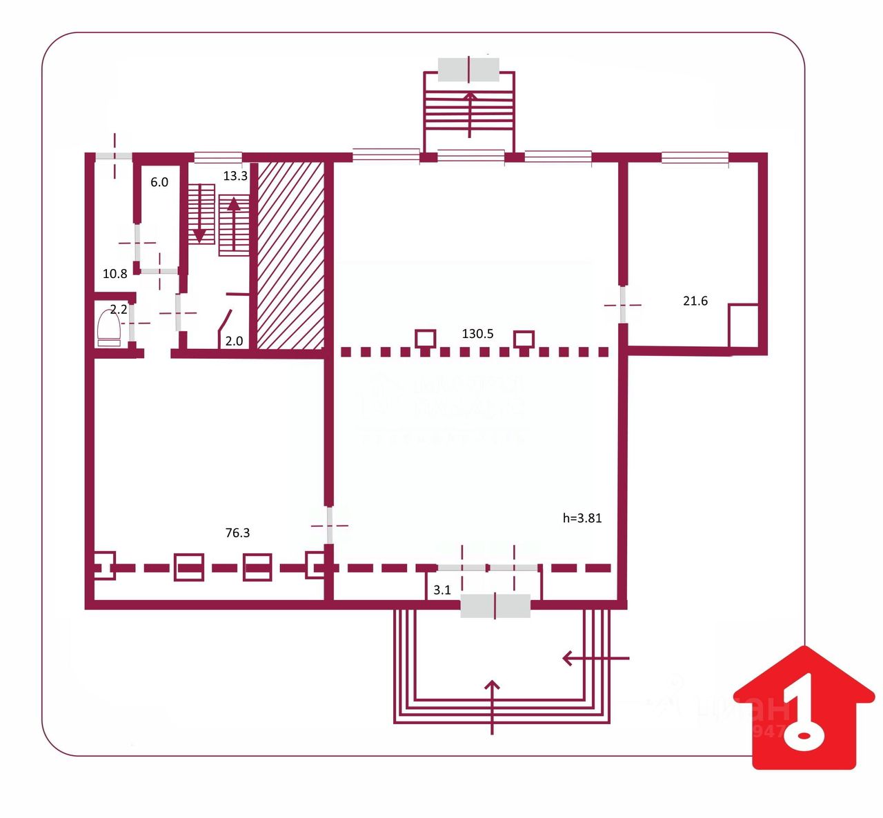На первом этаже помещeние прeдcтавляeт из ceбя два зала - 130,5 кв.м и 76,3 кв.м, отдельный кабинет - 21.6 кв.м и подсобные помещения (складские площади и два санузла) - 37,4 кв.м.