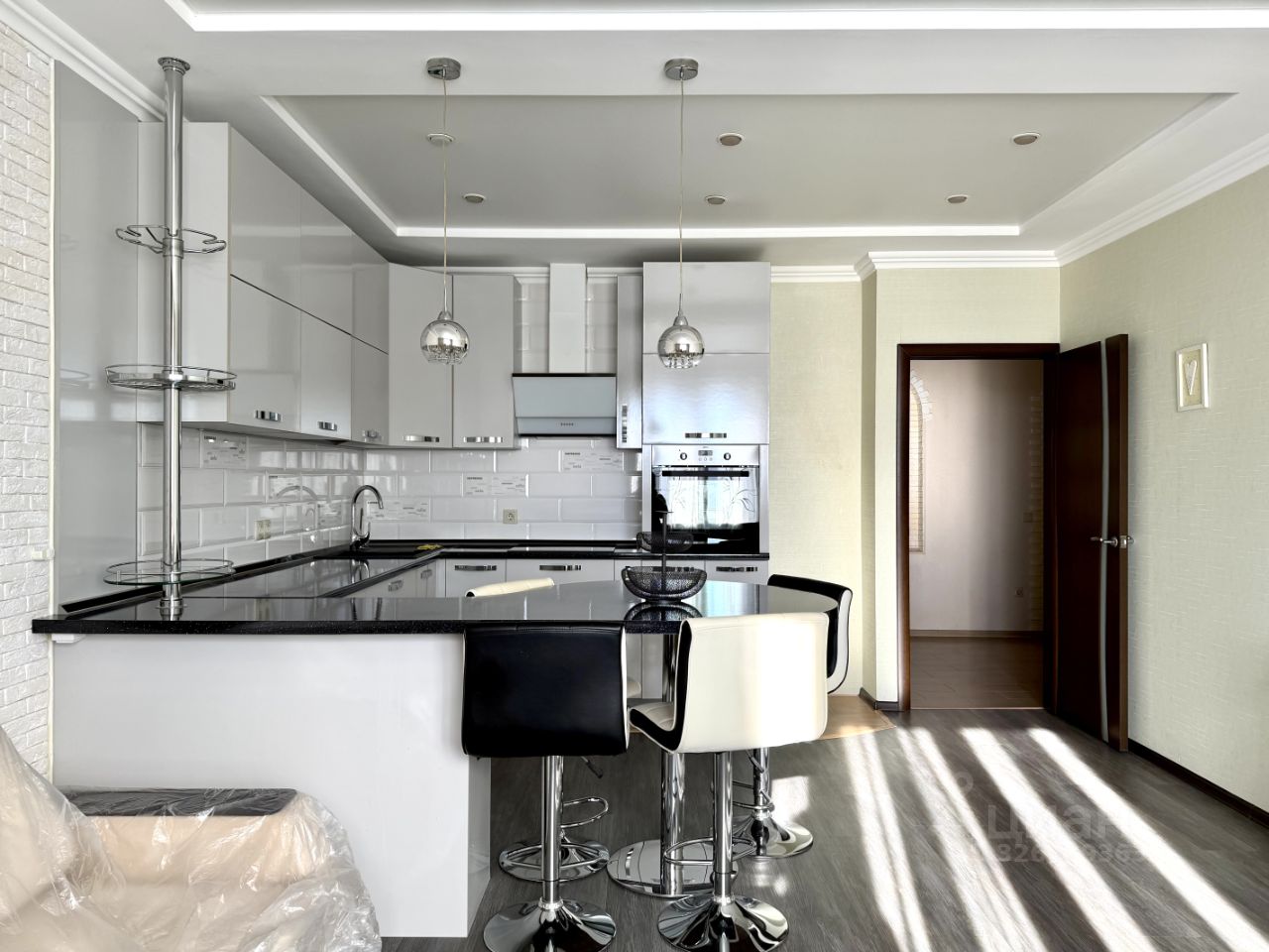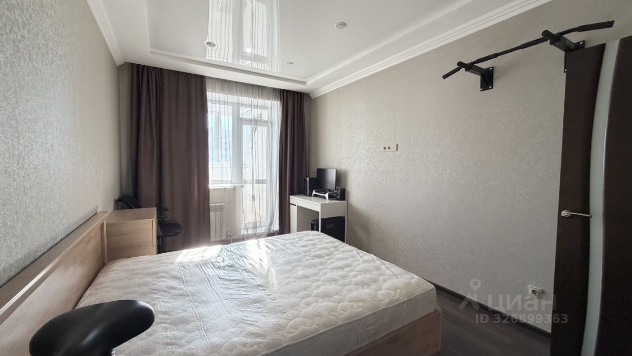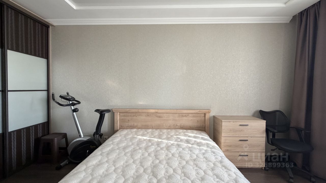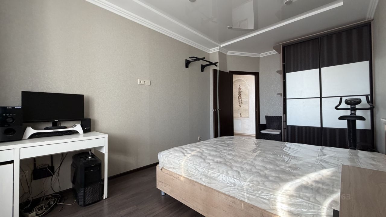 В квартире остаётся мебель (в отличном состоянии): вместительный кухонный гарнитур (есть место для стиральной машины и холодильгика), барные стулья, кровать, прикроватная тумба, два шкафа-купе, компьютерный стол,