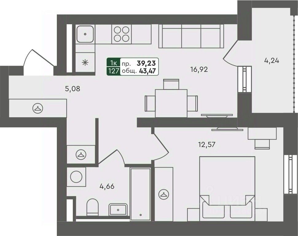 Продаётся 1-комнатная квартира в строящемся доме (ГП 2.1), срок сдачи: III-кв. 2026, общей площадью 43.47 кв.м., на 1 этаже.